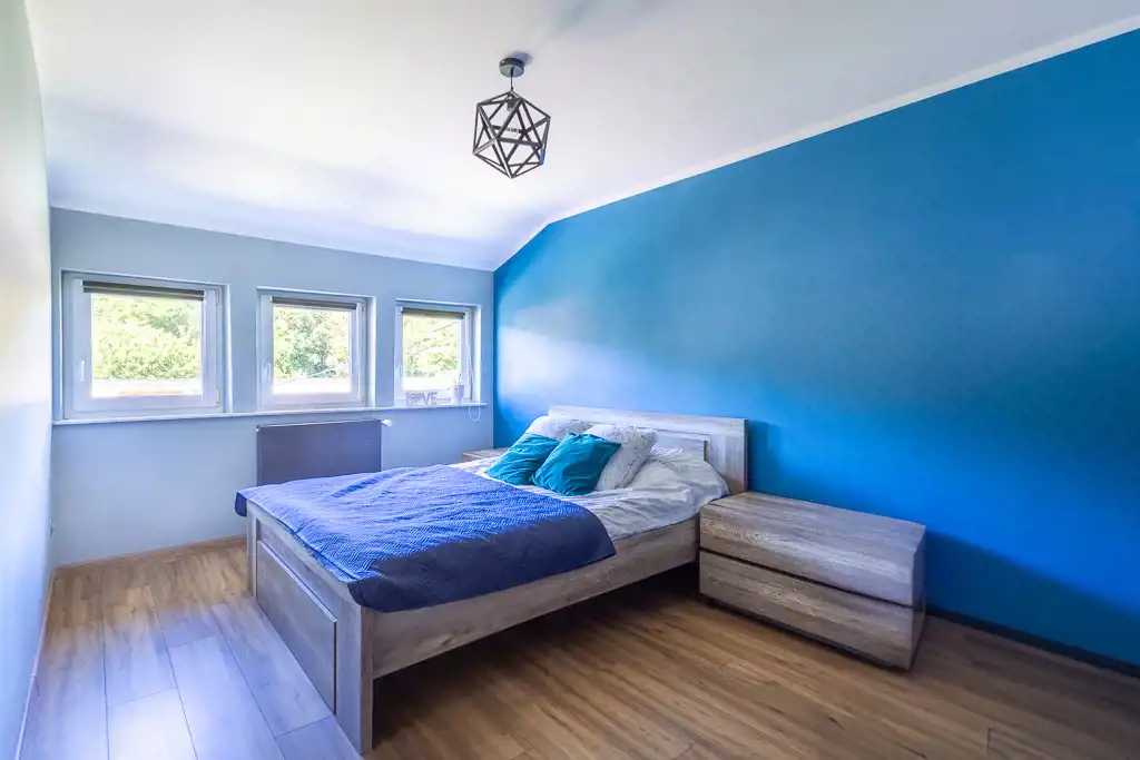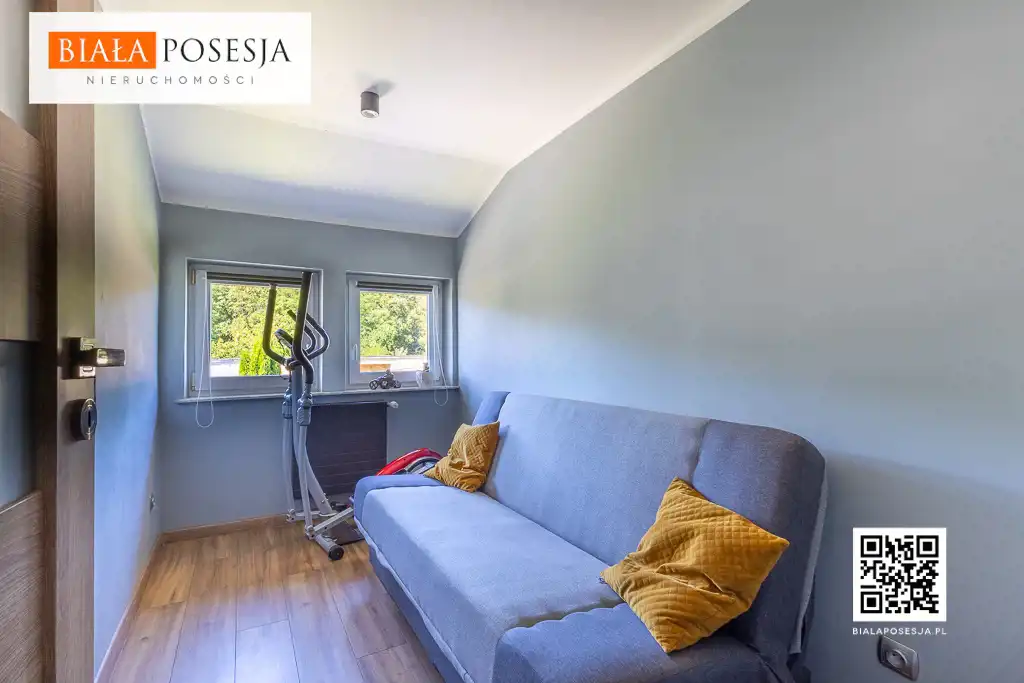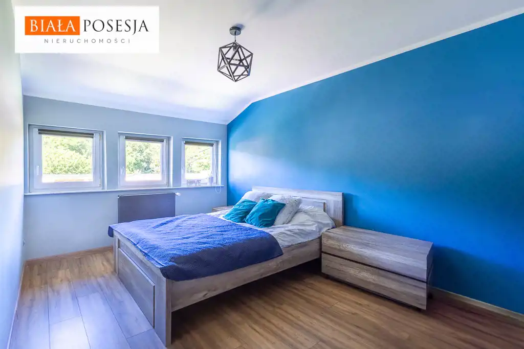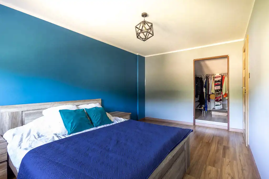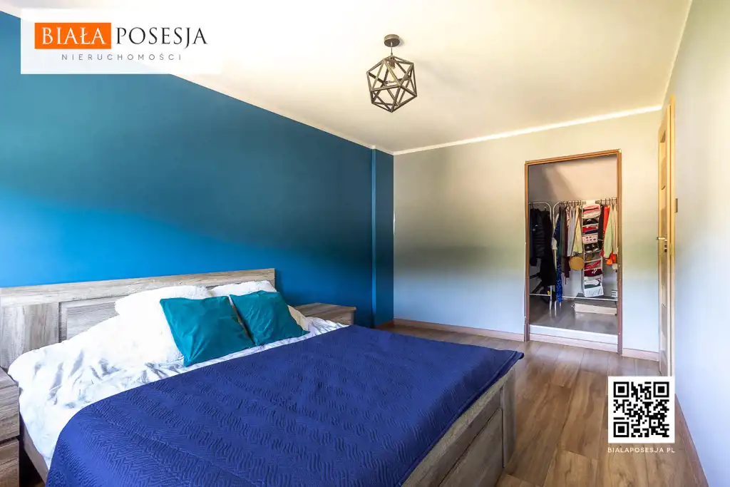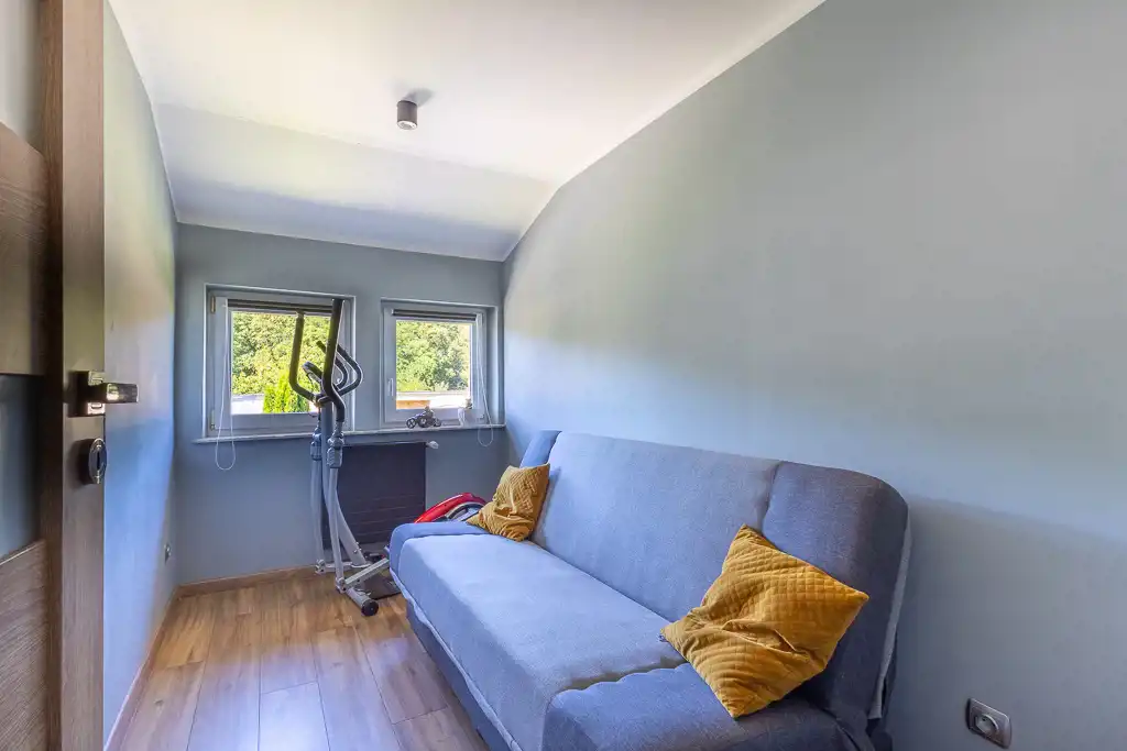 Na piętrze czeka na Ciebie przestronna sypialnia z wygodną garderobą oraz dodatkowy pokój – idealny dla dziecka, gości lub do pracy zdalnej.