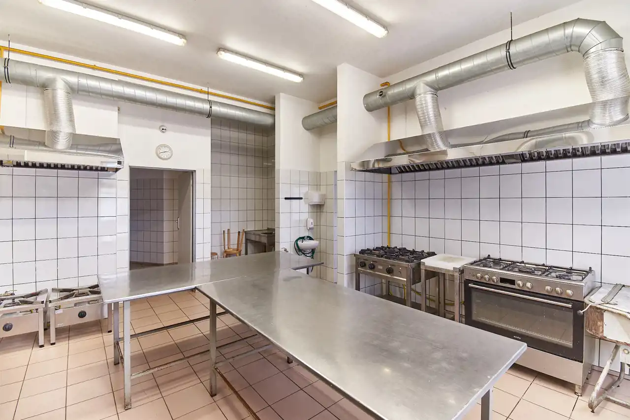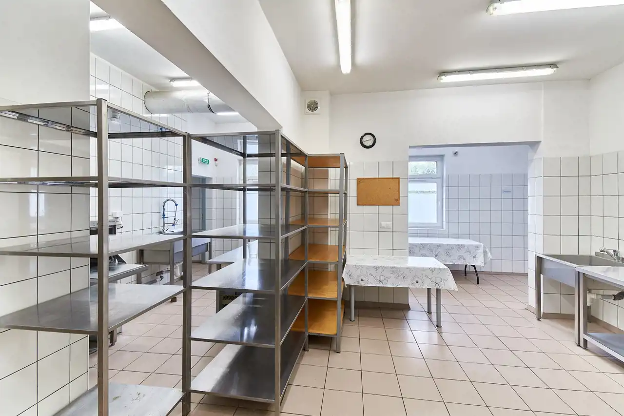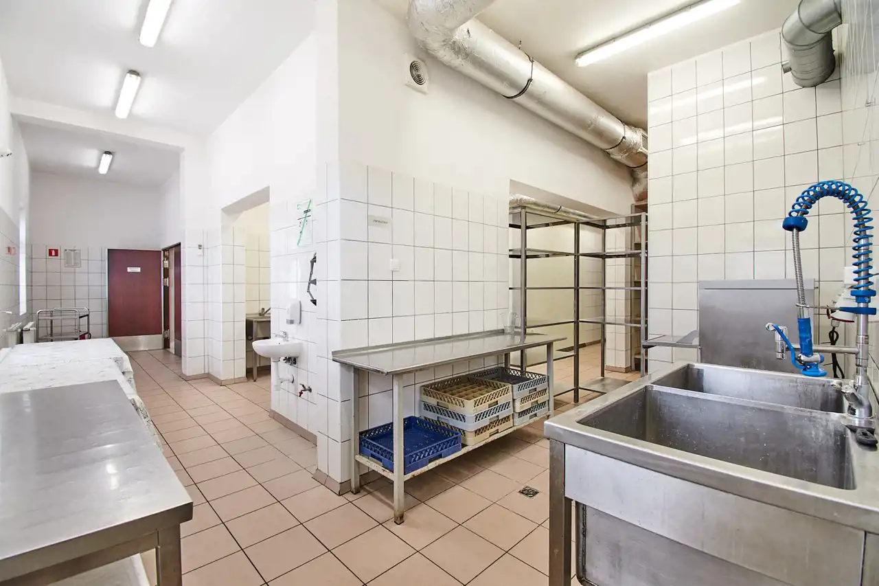 - Kuchnia i zaplecze do magazynowania i przechowywania-chłodnia o powierzchni 160 m2. Kuchnia wyposażona kompletnie w sprzęt elektryczny, gazowy, wentylacyjny umożliwiający łatwą produkcję cateringową;
