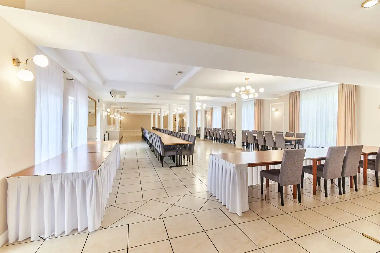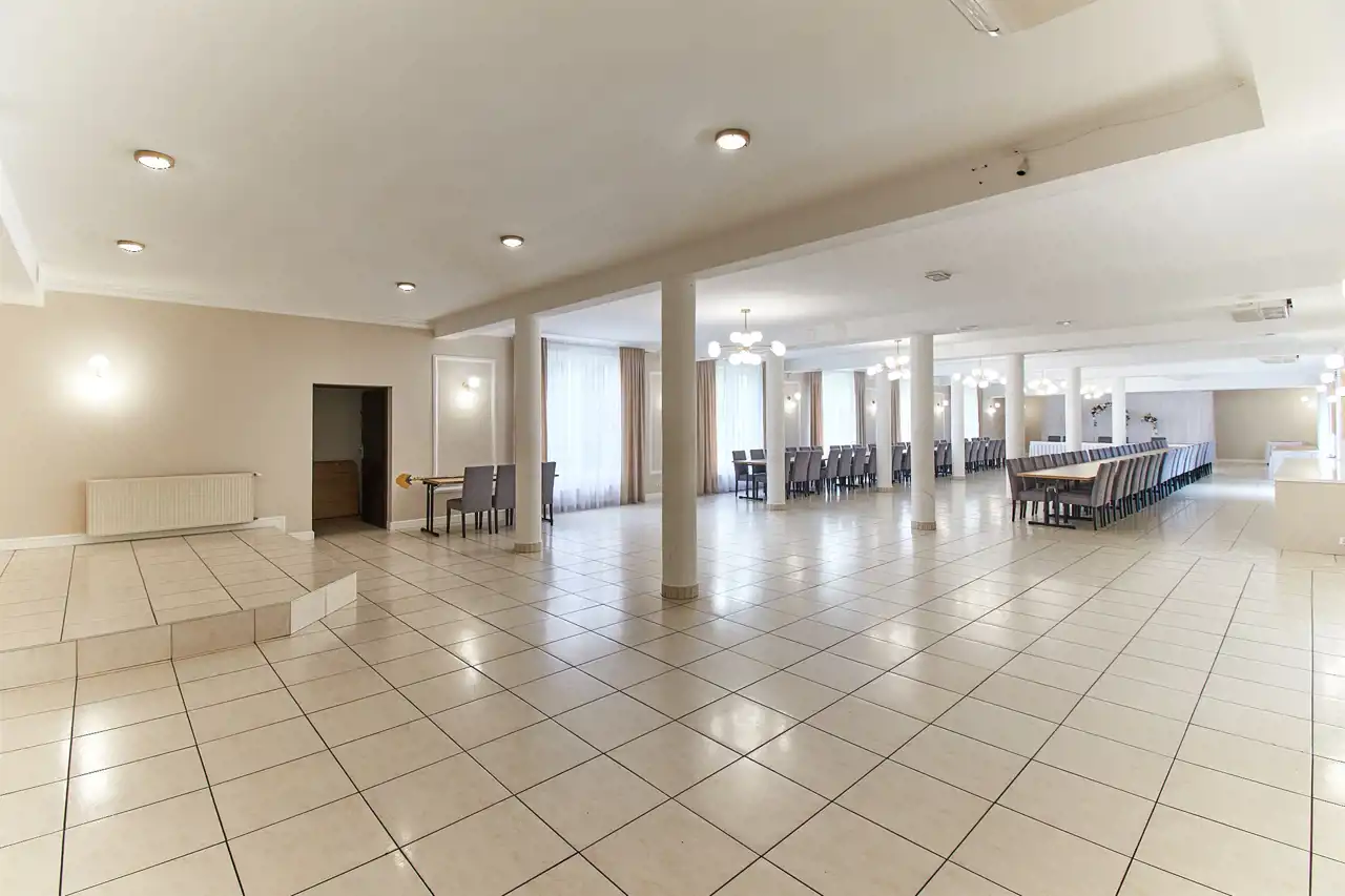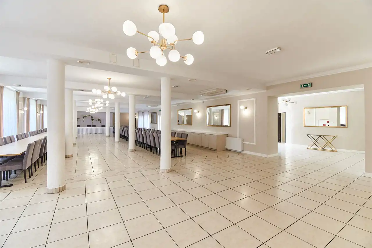 - Sala główna o powierzchni 300 m2 mieszcząca 180 osób przy imprezie tanecznej, 240 osób impreza zasiadanej;