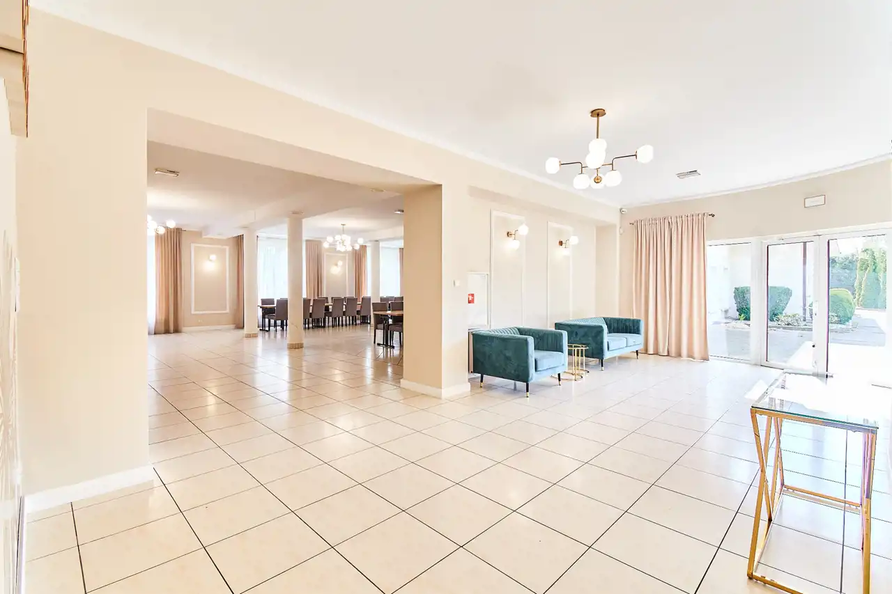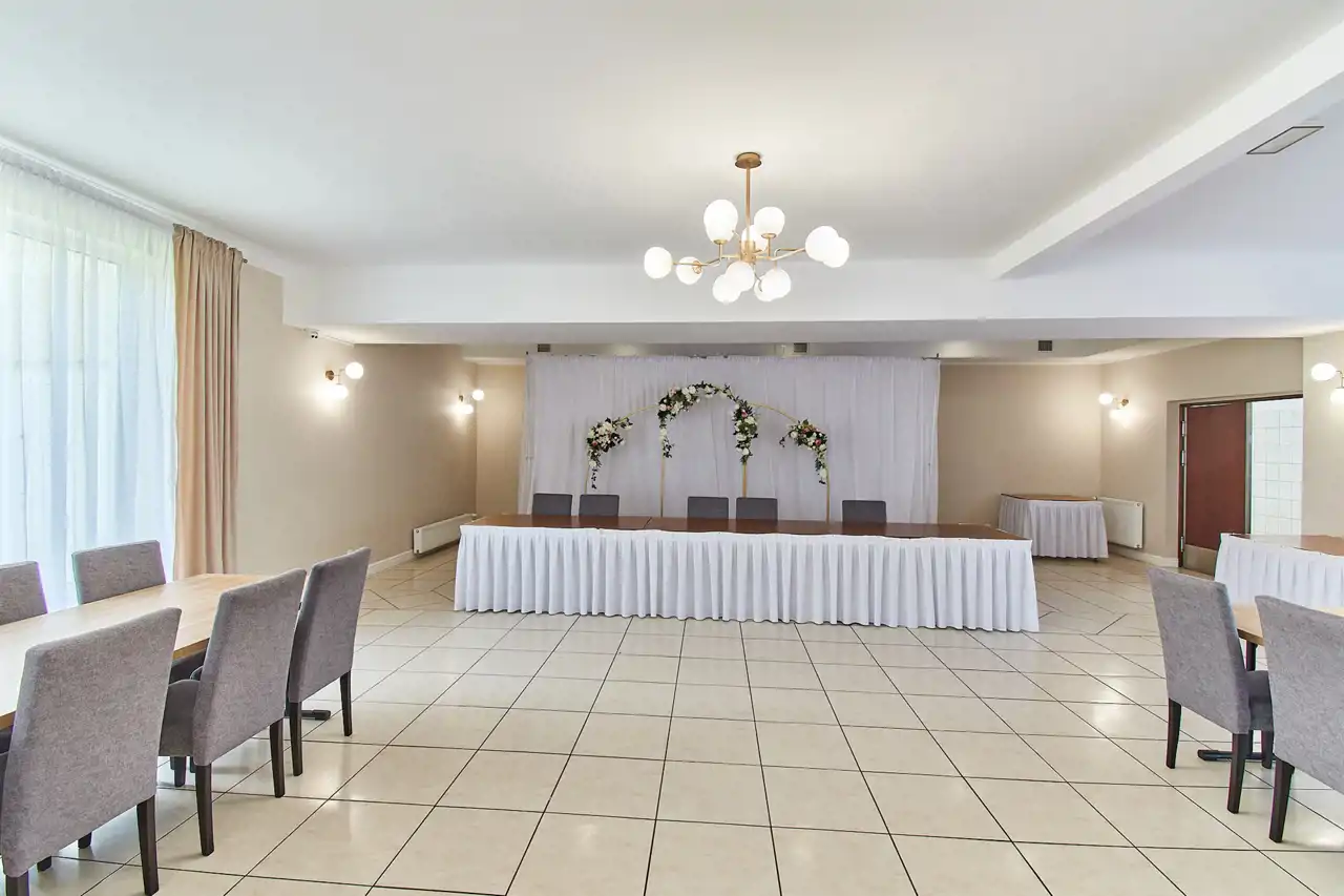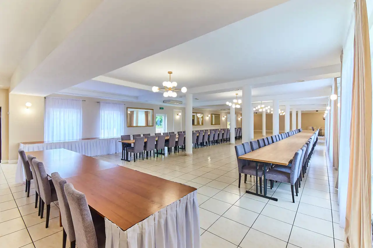 - Sala główna o powierzchni 300 m2 mieszcząca 180 osób przy imprezie tanecznej, 240 osób impreza zasiadanej;
