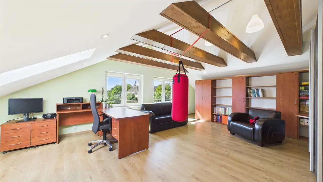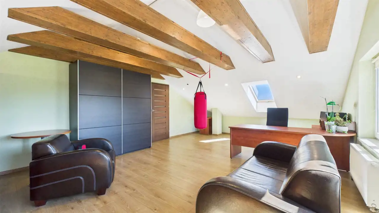 przestronny pokój z odkrytymi belkami (może być gabinet, siłownia lub dodatkowa sypialnia),