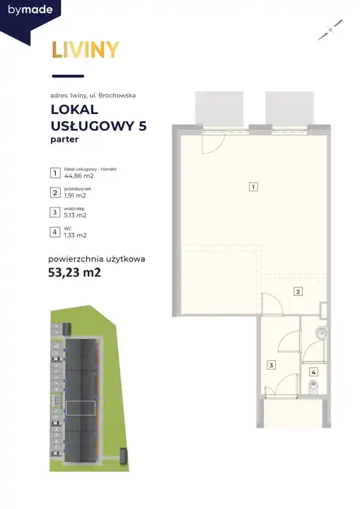 Prezentujemy Państwu lokal usługowo-handlowy na wynajem o powierzchni 53,23 m2 w kameralnej inwestycji zlokalizowanej w Iwinach pod Wrocławiem, pomiędzy ul. Brochowską i Miodową.