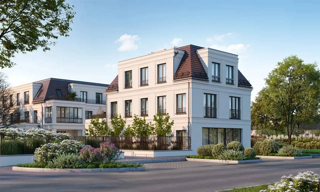 Dziewięć willi miejskich o harmonijnej, klasycystycznej linii rozplanowano z rozmachem na dwóch hektarach zieleni. Architektura osiedla nawiązuje do najlepszych europejskich wzorców — ponadczasowa, elegancka, z wyważoną kolorystyką elewacji i perfekcyjnie dopracowanymi detalami. Wnętrza imponują przestrzenią i światłem — panoramiczne przeszklenia oraz wysokość pomieszczeń sięgająca 2,8 metra sprawiają, że każdy apartament oddycha swobodą.