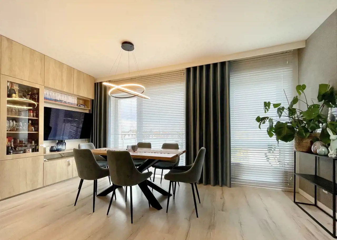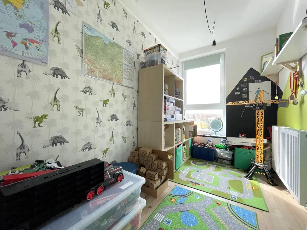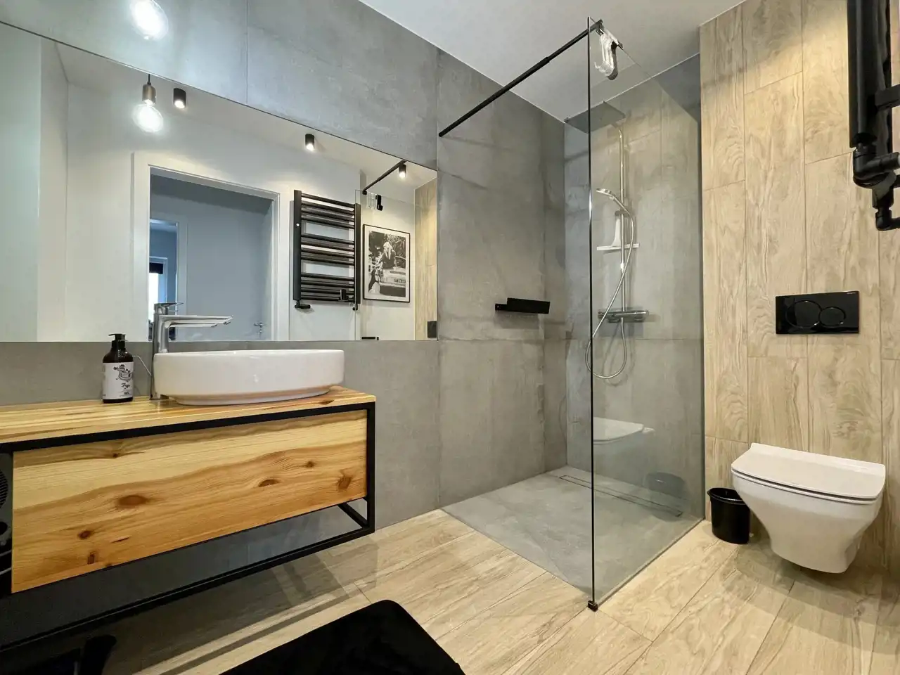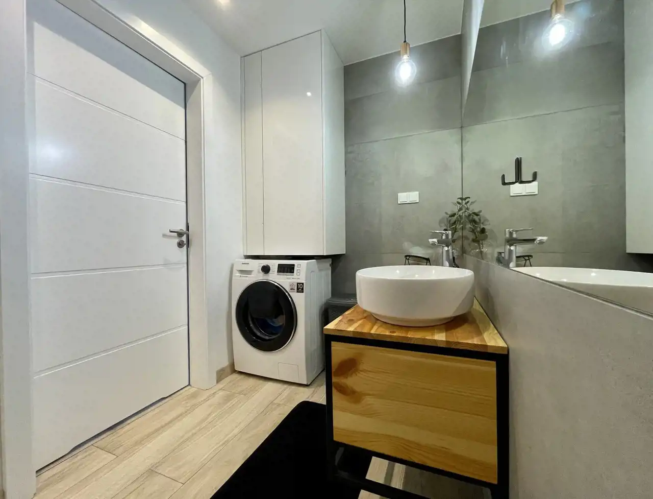 Funkcjonalna kuchnia wraz z meblami na wymiar oraz sprzętem AGD w zabudowie (piekarnik, mikrofalówka, zmywarka, płyta grzewcza), dodatkowo wnęka na lodówkę wolnostojącą. W części dziennej duży rodzinny stół na 6 krzeseł, ponadto meble pod telewizor również wykonane na zamówienie. W oknach szerokie żaluzje oraz eleganckie zasłony. Dodatkowo na pierwszej kondygnacji mieszkania znajdziemy dwie odrębne sypialnie z czego jedna z dużą pojemną szafą czterodrzwiową z frontami w formie lustra. W łazience dominuje minimalizm: kabina prysznicowa typu walki in z odpływem liniowym, toaleta w zestawie podtynkowym oraz szafka z umywalką. Dodatkowo praktyczna szafka wisząca oraz pralka.