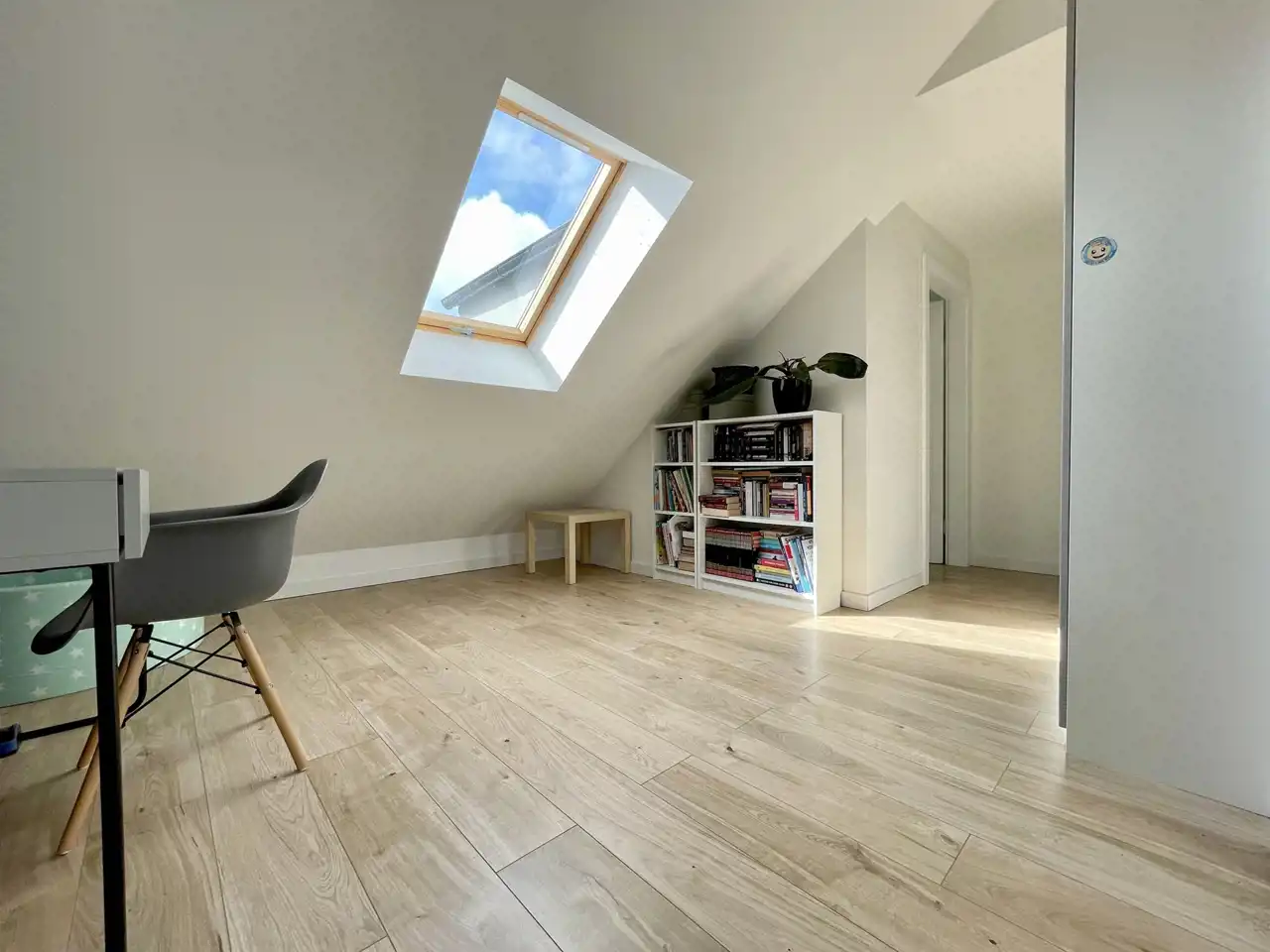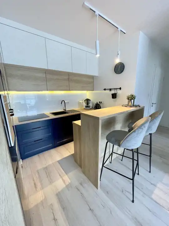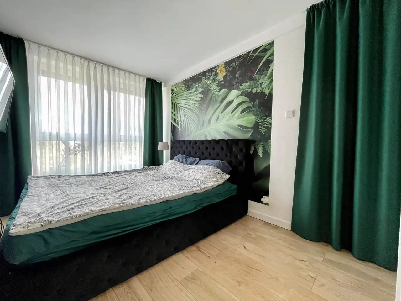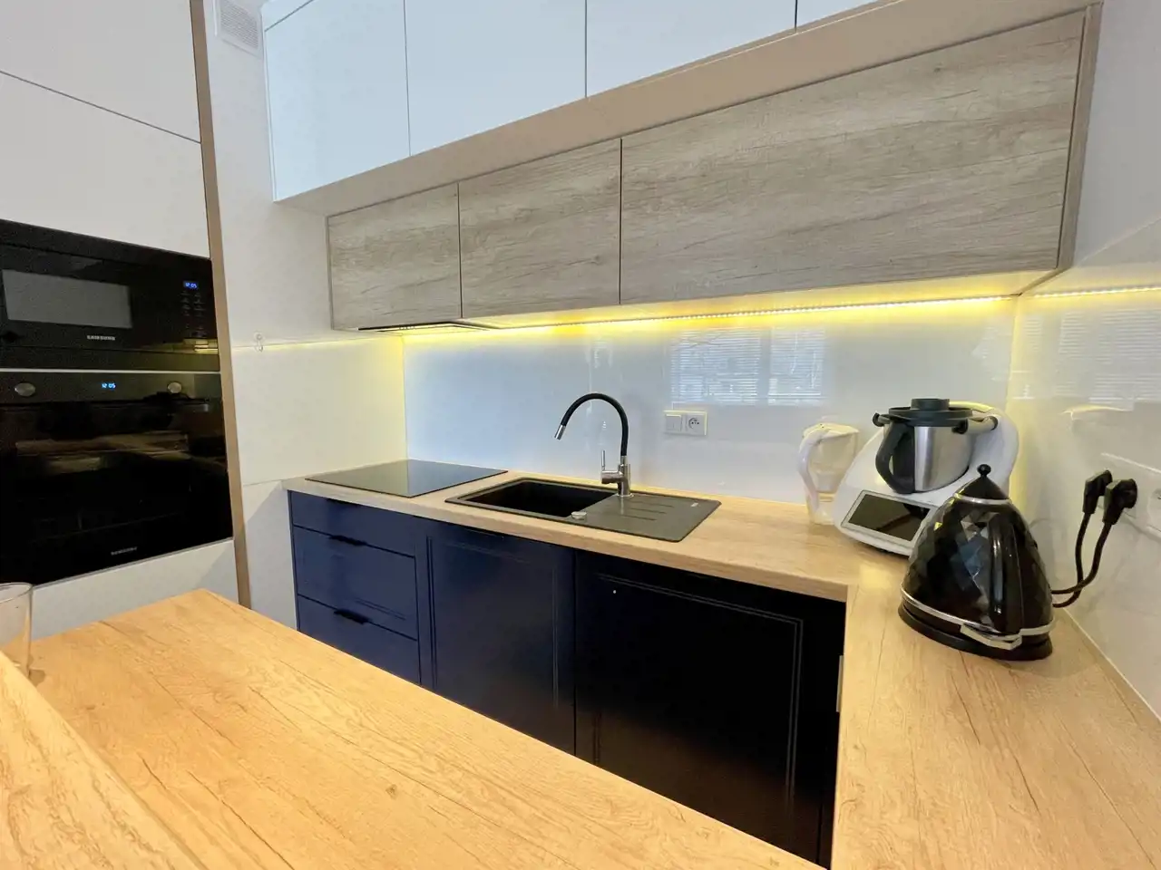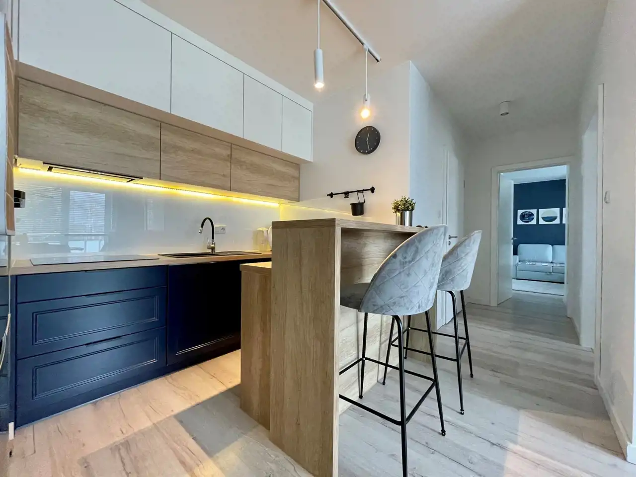 Funkcjonalna kuchnia wraz z meblami na wymiar oraz sprzętem AGD w zabudowie (piekarnik, mikrofalówka, zmywarka, płyta grzewcza), dodatkowo wnęka na lodówkę wolnostojącą. W części dziennej duży rodzinny stół na 6 krzeseł, ponadto meble pod telewizor również wykonane na zamówienie. W oknach szerokie żaluzje oraz eleganckie zasłony. Dodatkowo na pierwszej kondygnacji mieszkania znajdziemy dwie odrębne sypialnie z czego jedna z dużą pojemną szafą czterodrzwiową z frontami w formie lustra. W łazience dominuje minimalizm: kabina prysznicowa typu walki in z odpływem liniowym, toaleta w zestawie podtynkowym oraz szafka z umywalką. Dodatkowo praktyczna szafka wisząca oraz pralka.