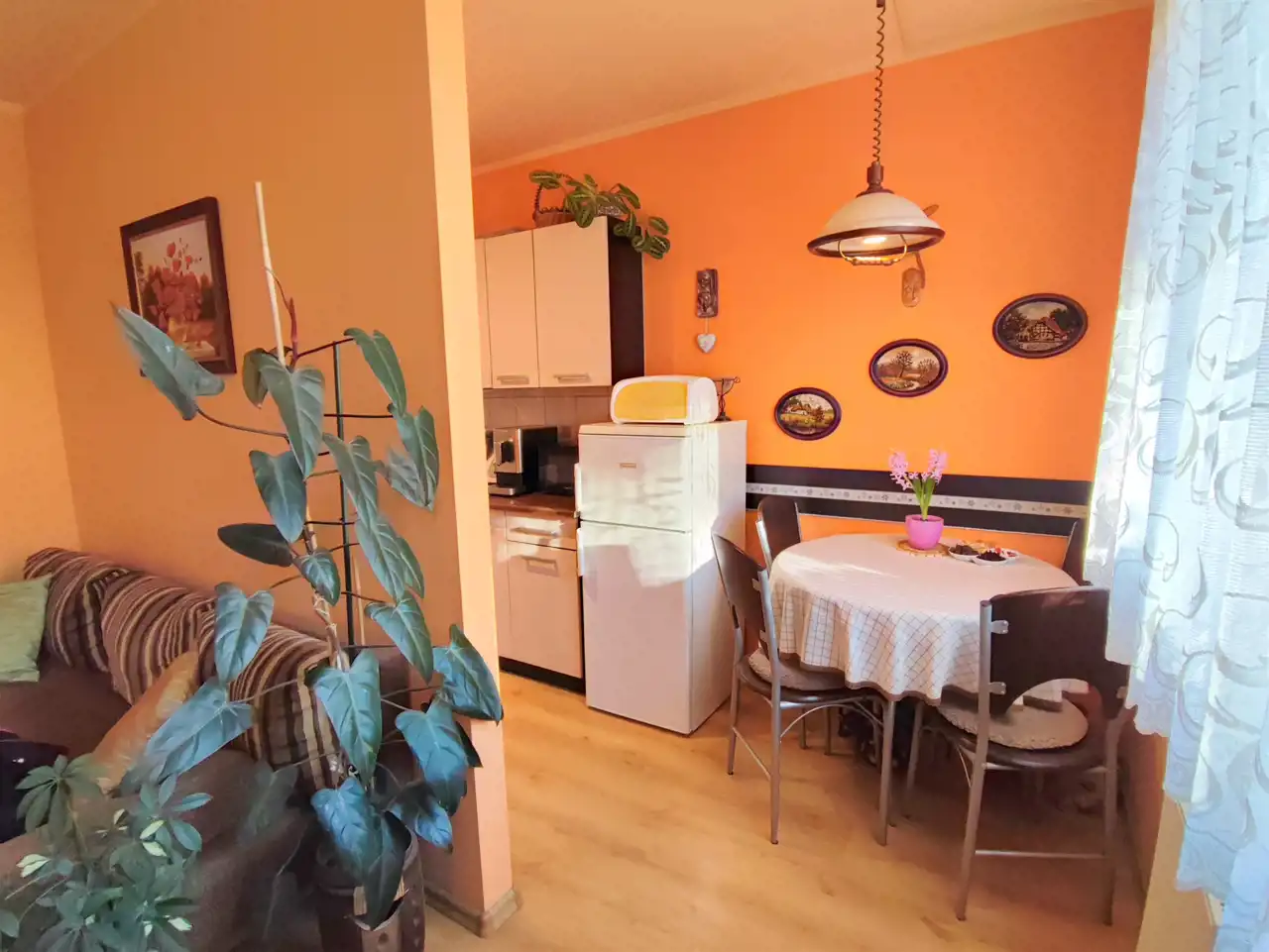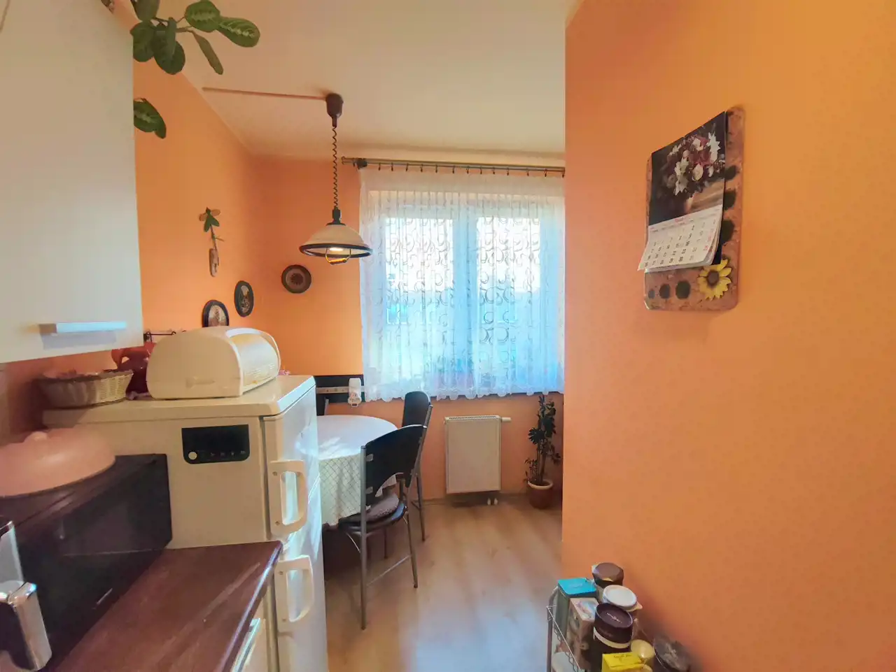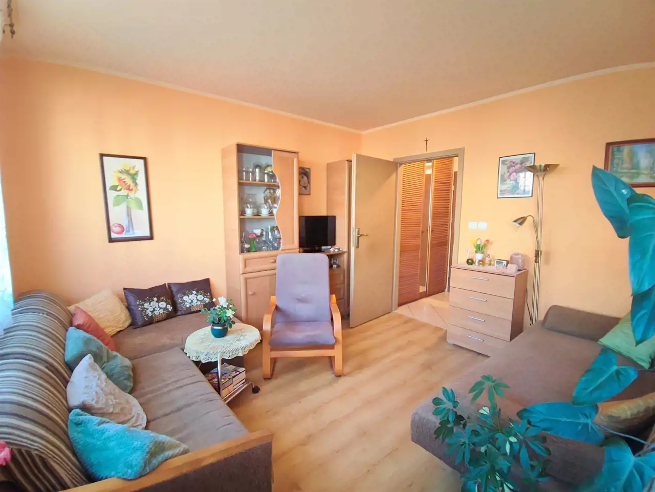Wnętrze zostało przemyślane i zaaranżowane z dbałością o wygodę. Wydzielona została osobna kuchnia z częścią jadalnianą, co widać na zdjęciach — to rozwiązanie, które znacząco podnosi komfort codziennego życia. Salon pozostał ustawny i daje wiele możliwości aranżacyjnych. Łazienka z wanną i WC, przedpokój z praktyczną szafą, a całość utrzymana w ciepłej, domowej atmosferze.