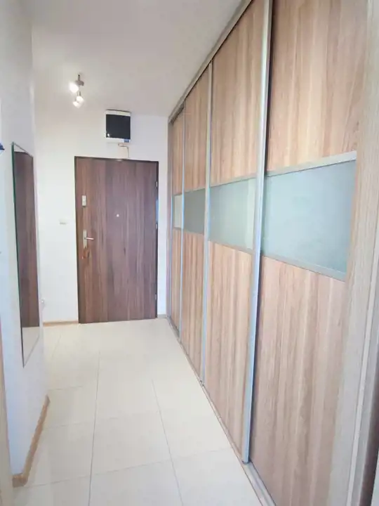Wnętrze składa się z przytulnego salonu z kompletnie urządzonym aneksem kuchennym wyposażonym w sprzęt AGD, z którego prowadzi wyjście na kameralny balkon o powierzchni 3,5 m². Do tego oddzielna sypialnia, przestronny przedpokój z dużą szafą typu komandor oraz łazienka z wanną i WC. W aneksie, przedpokoju i łazience położone są kafle, natomiast w pokojach panele. Wszystkie media miejskie, czynsz 550 zł.