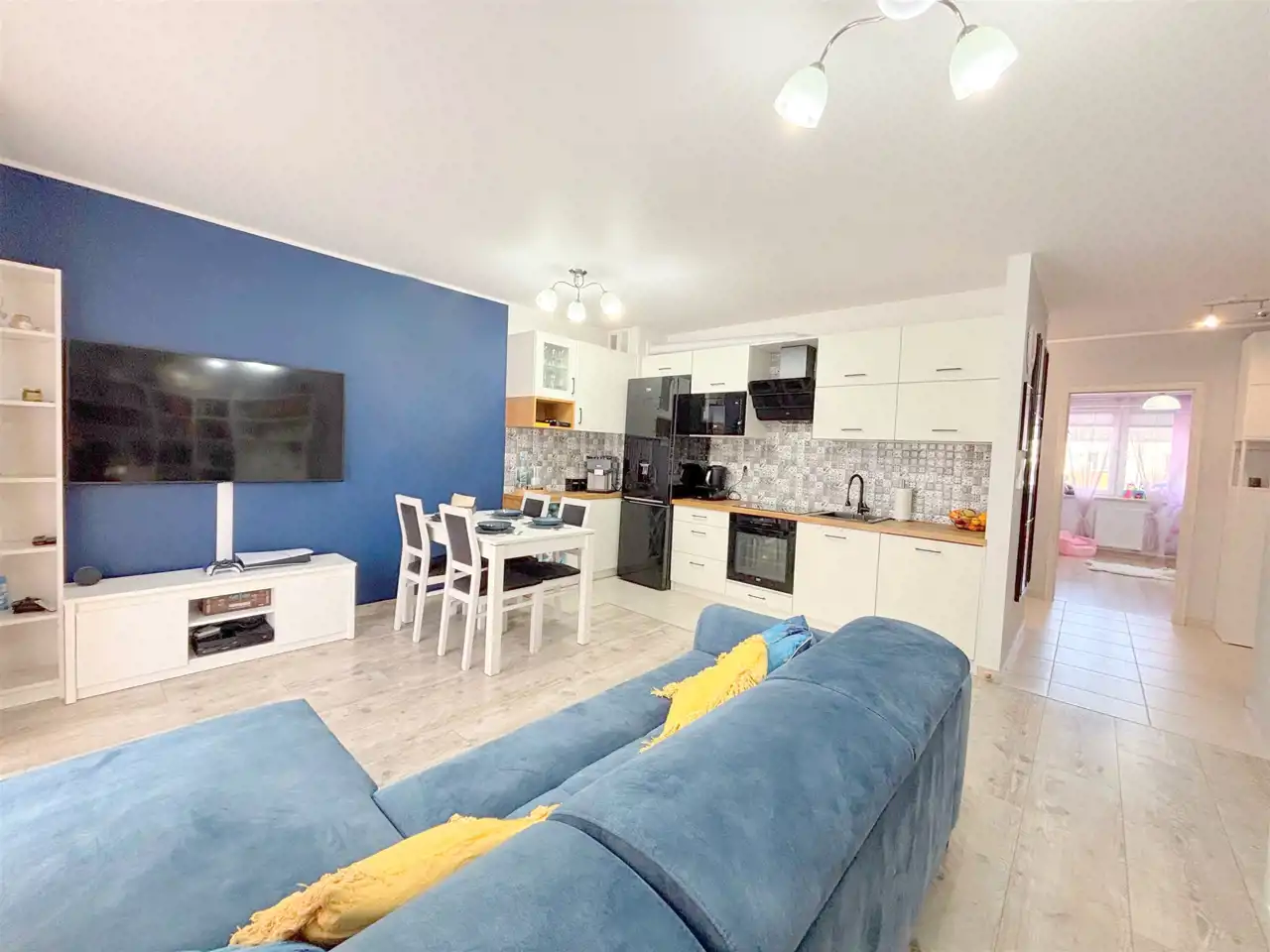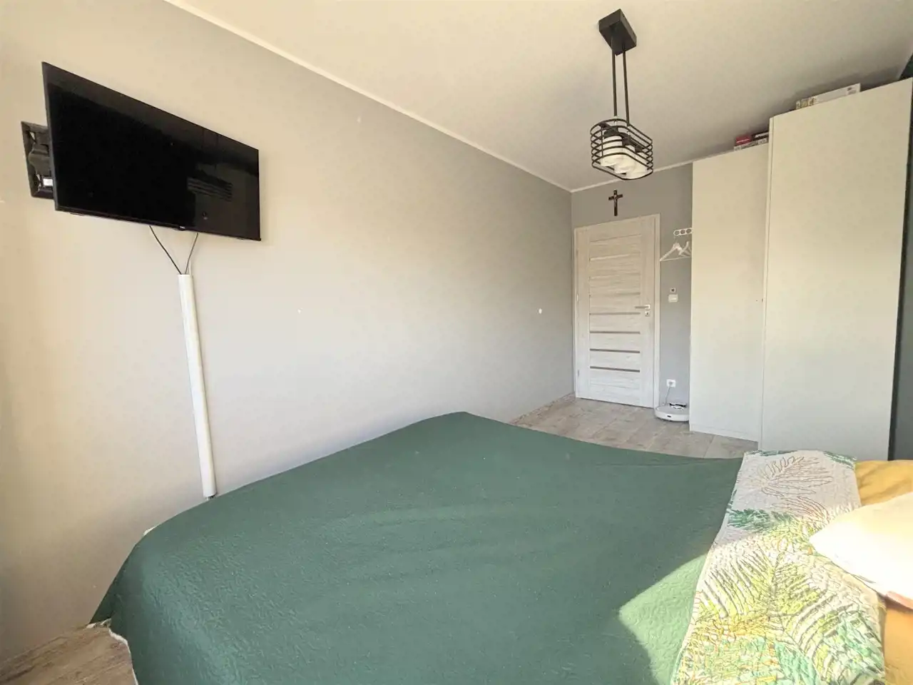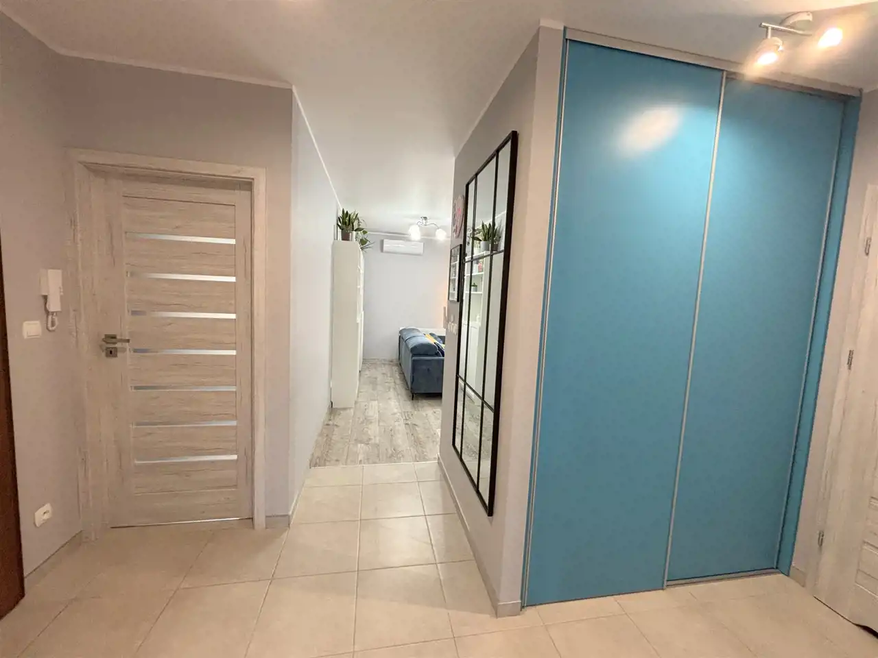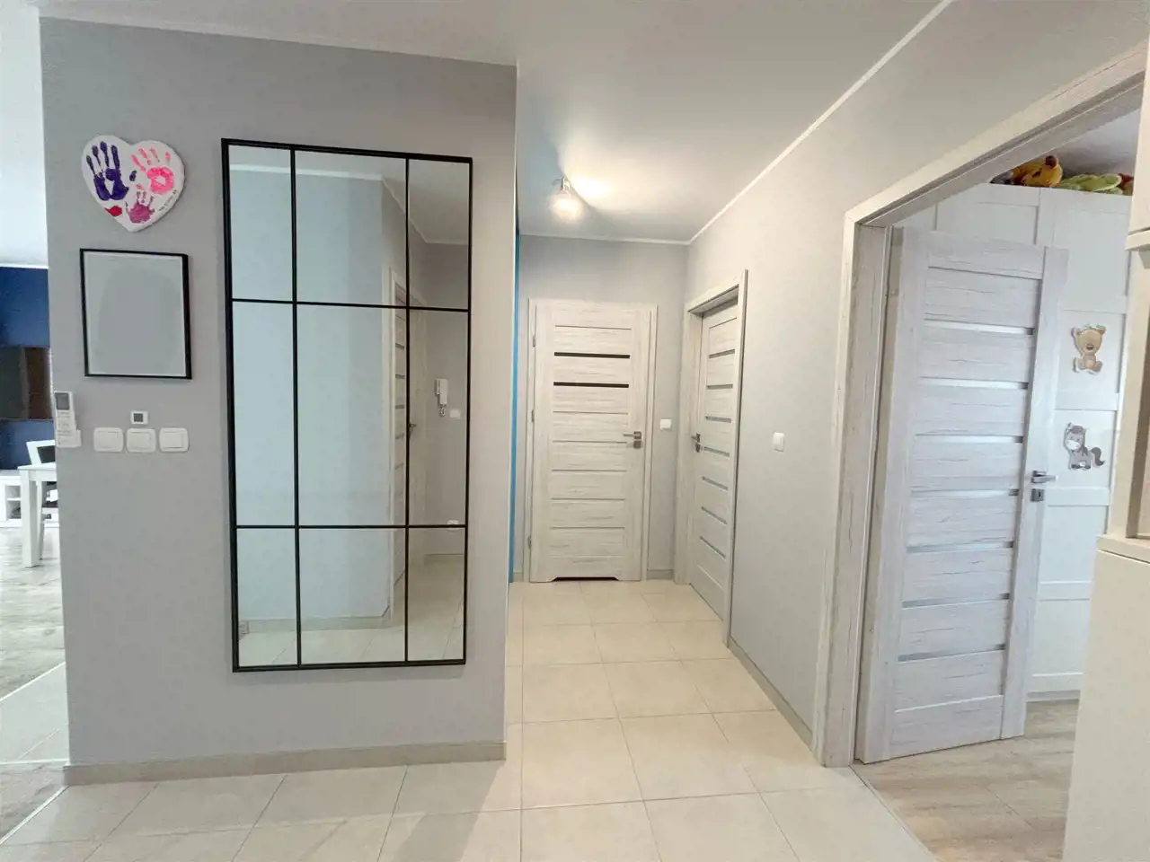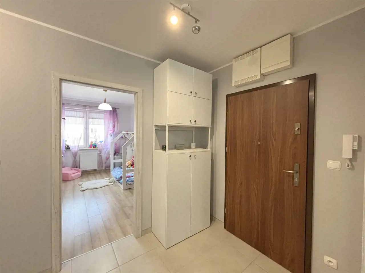 Wnętrze zostało zaprojektowane z myślą o wygodzie codziennego życia. W pokojach położono panele, natomiast w części komunikacyjnej, aneksie kuchennym, przedpokoju i łazience zastosowano praktyczne kafle. Salon z aneksem kuchennym tworzy jasną, otwartą przestrzeń, która naturalnie staje się sercem mieszkania. Meble kuchenne wraz ze sprzętem AGD pozostają w mieszkaniu. W łazience znajduje się pralka i suszarka, które również zostają do dyspozycji nowego właściciela. W przedpokoju umieszczono pojemną szafę w zabudowie, która również pozostaje na miejscu.
