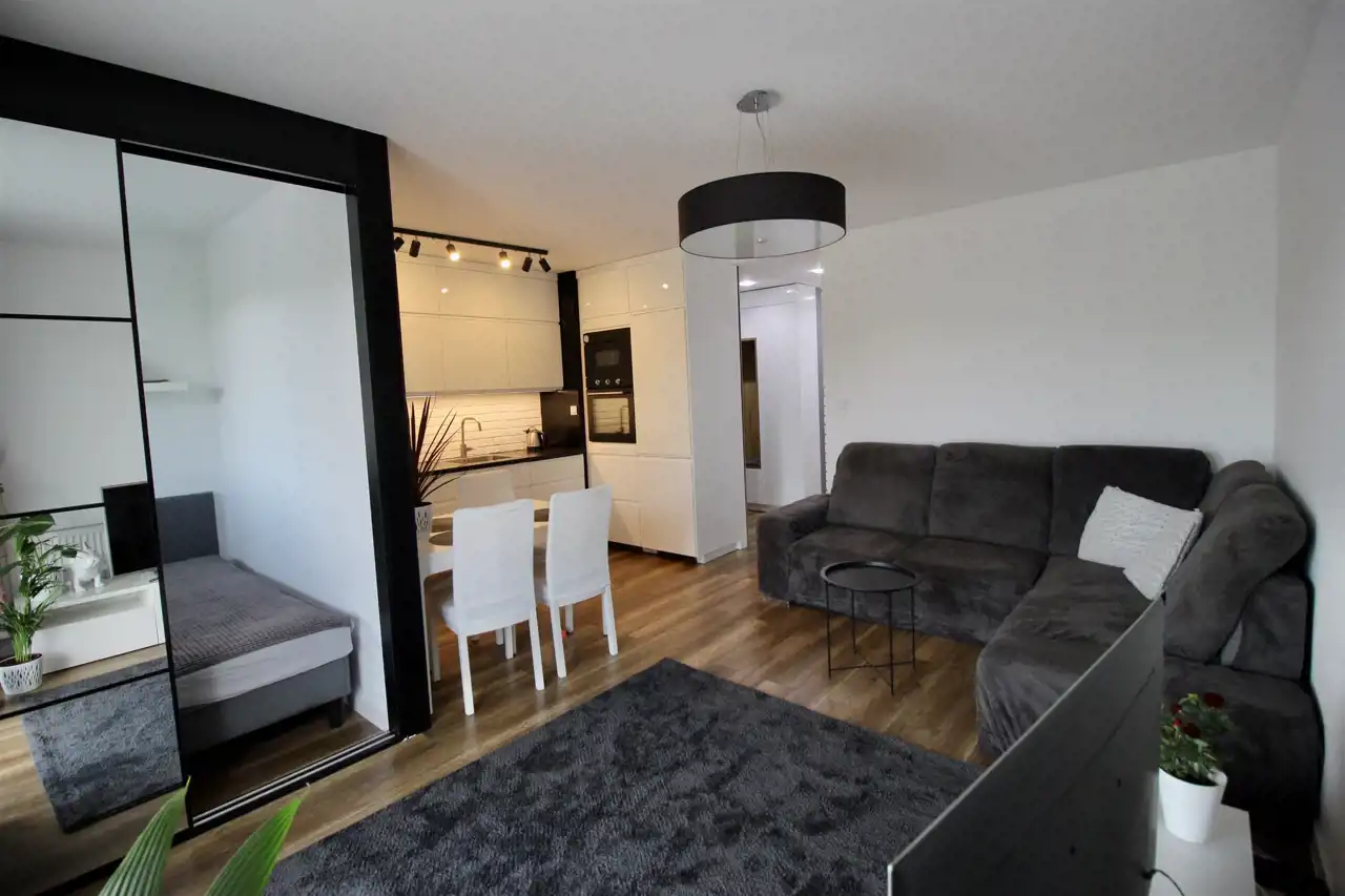 W mieszkaniu znajduje się kuchnia z meblami w zabudowie wykonana pod zamówienie i wyposażona w sprzęt AGD – płytę indukcyjną, piekarnik, lodówkę, zmywarkę oraz okap. W łazience jest pralka oraz suszarka ukryta w zabudowie.
