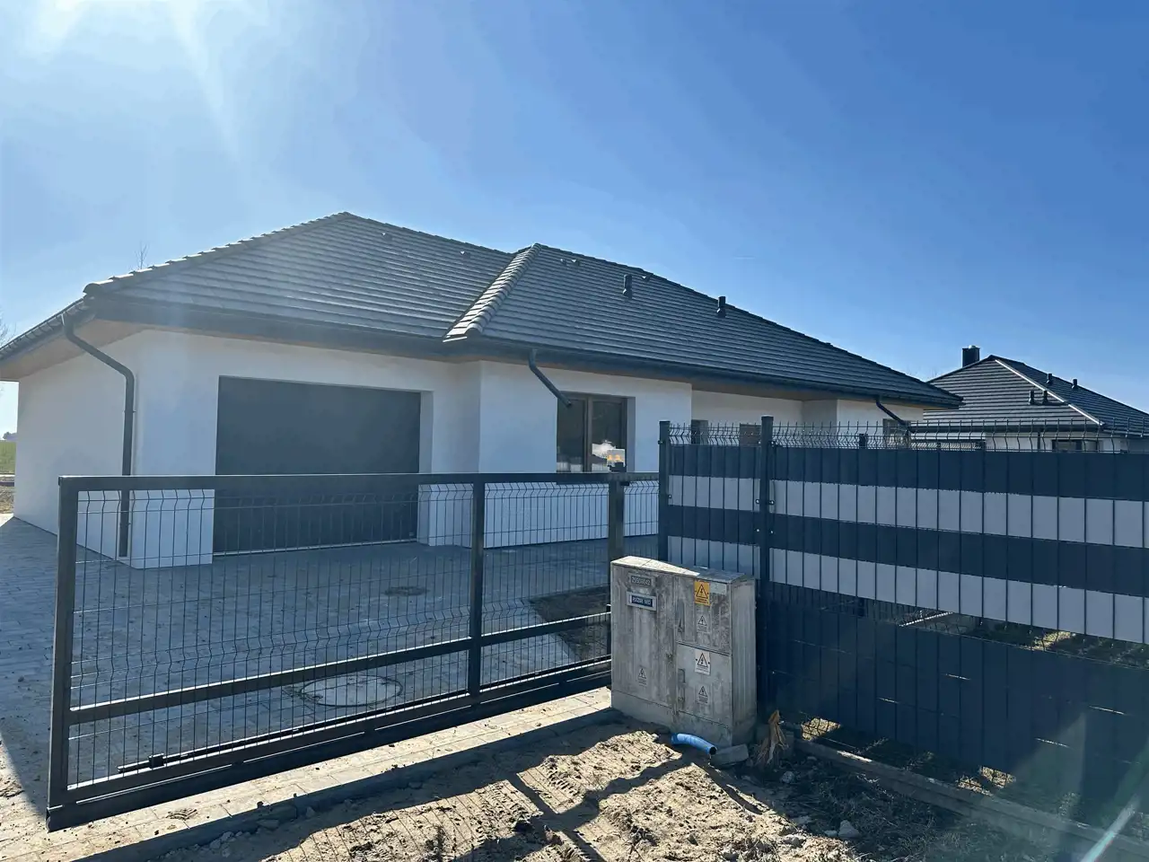 Wolnostojący, parterowy dom jednorodzinny z garażem w bryle i tarasem, ogrodzony.