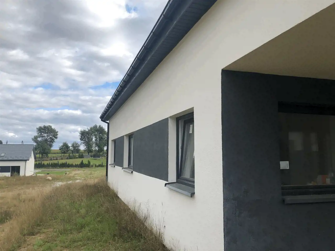 Standard deweloperski obejmuje: białe elewacje, w pucu z żywicą dekoracyjną przy wejściach, brązowa blachodachówka, okna pcv - dąb złocisty,