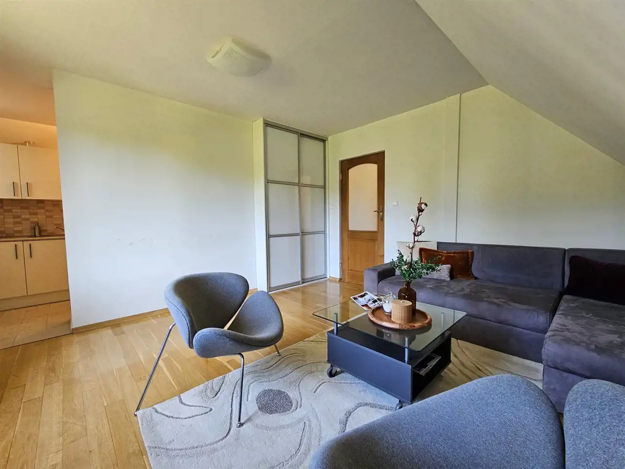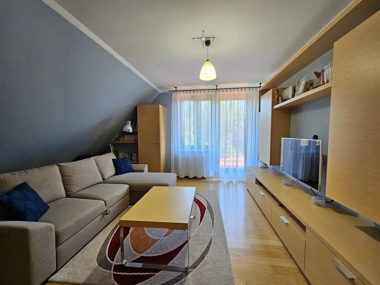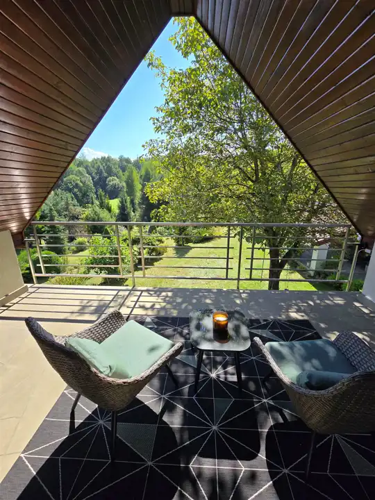 Na poddaszu znajdują się trzy przestronne sypialnie, jedna w wydzieloną kuchnią, łazienka z toaletą, oraz otwarta przestrzeń, którą można zagospodarować w dogodny dla siebie sposób, stół bilardowy lub ping pong, albo piękna biblioteczka. Komfort dodają dwa balkony z pięknym widokiem.