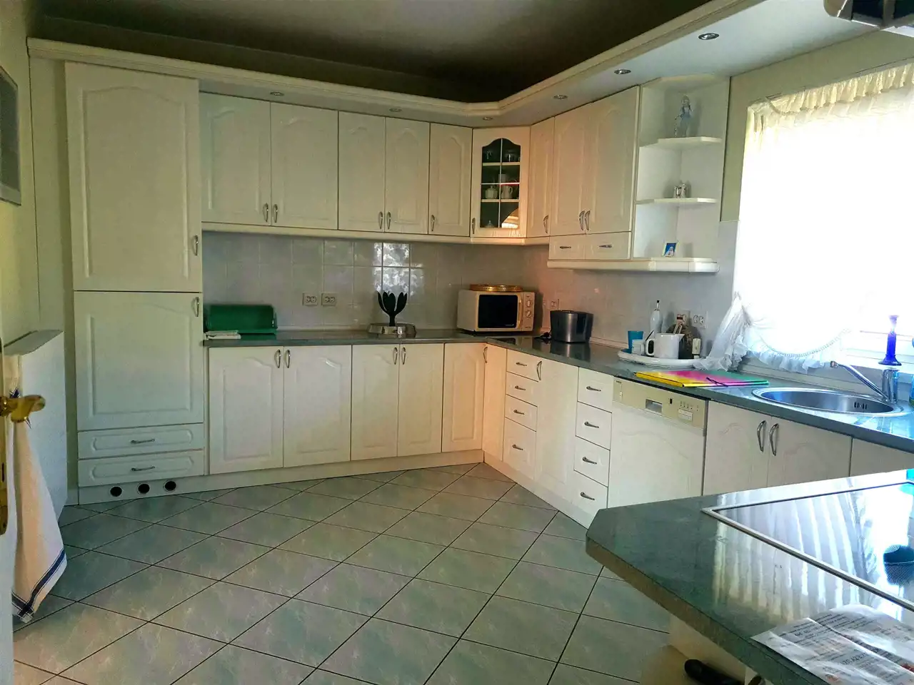 Parter - tutaj znajduje się piękna , duża, przestronna kuchnia z nowoczesnymi meblami i sprzętem w zabudowie z łukowym przejściem do przestronnej , w pełni wyposażonej jadalni skąd możemy wyjść na zewnątrz na ogromny taras !