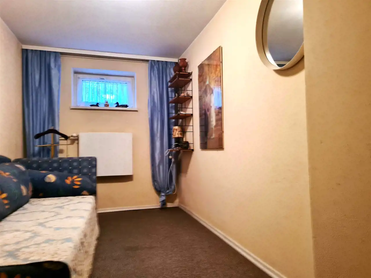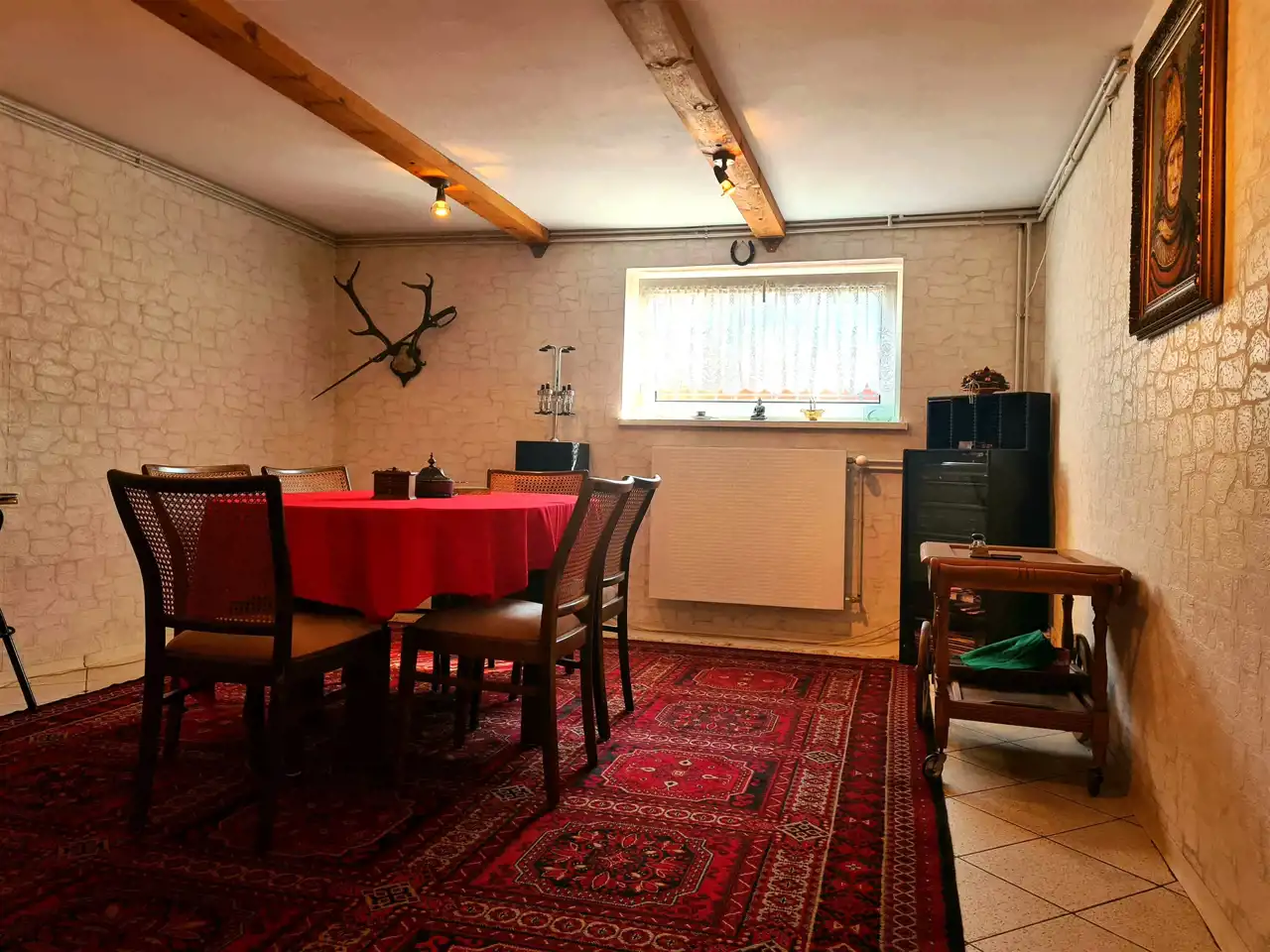 piwnica - przyziemie ,wysokie , przestronne . Znajdują się tutaj : kotłownia , pralnia-prasowalnia , gabinet/biuro , sypialnia , oraz " męska jaskinia " lub inaczej- pokój gier i zabaw .