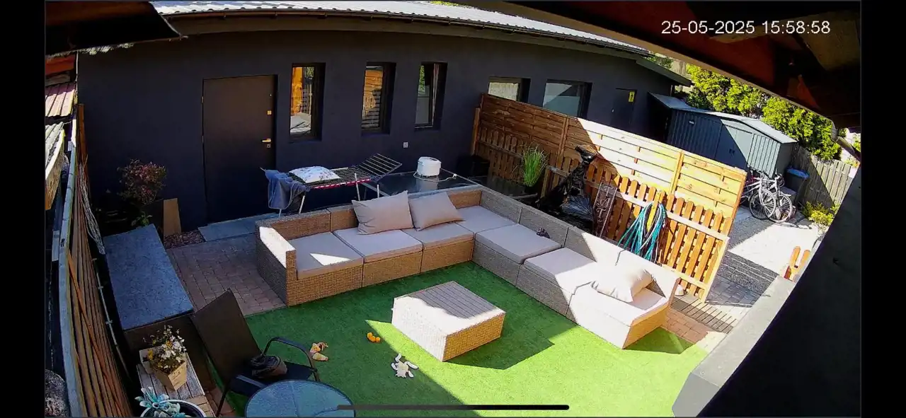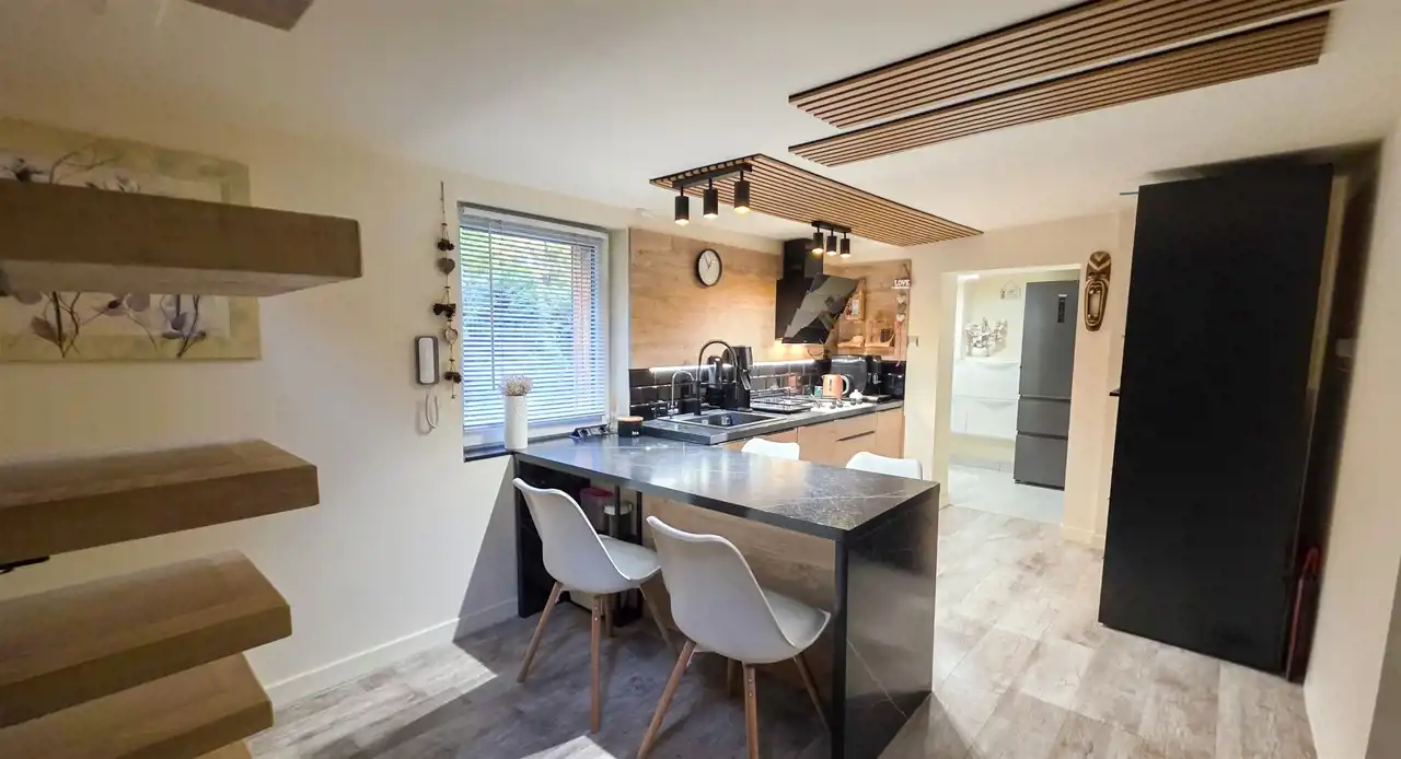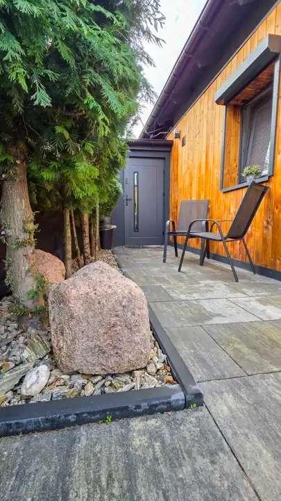 Dom został ocieplony, otynkowany i wykończony w 2024 roku – w nowoczesnym stylu, z elementami drewna i czarnej stali.