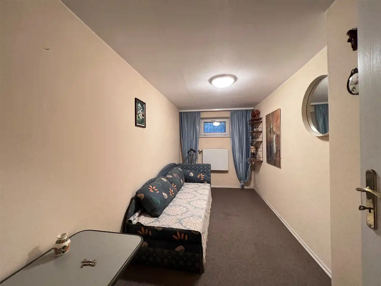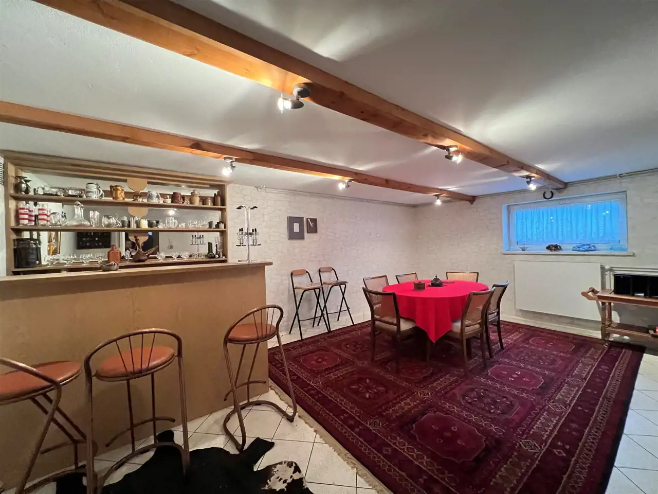 piwnica - przyziemie, wysokie, przestronne . Znajdują się tutaj: kotłownia, pralnia-prasowalnia, gabinet/biuro , sypialnia, oraz " męska jaskinia " lub inaczej - pokój gier i zabaw .