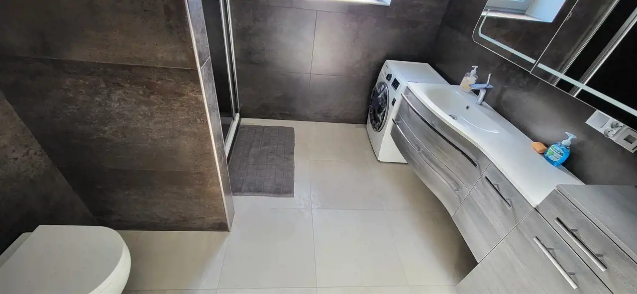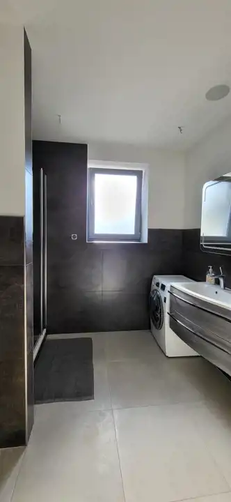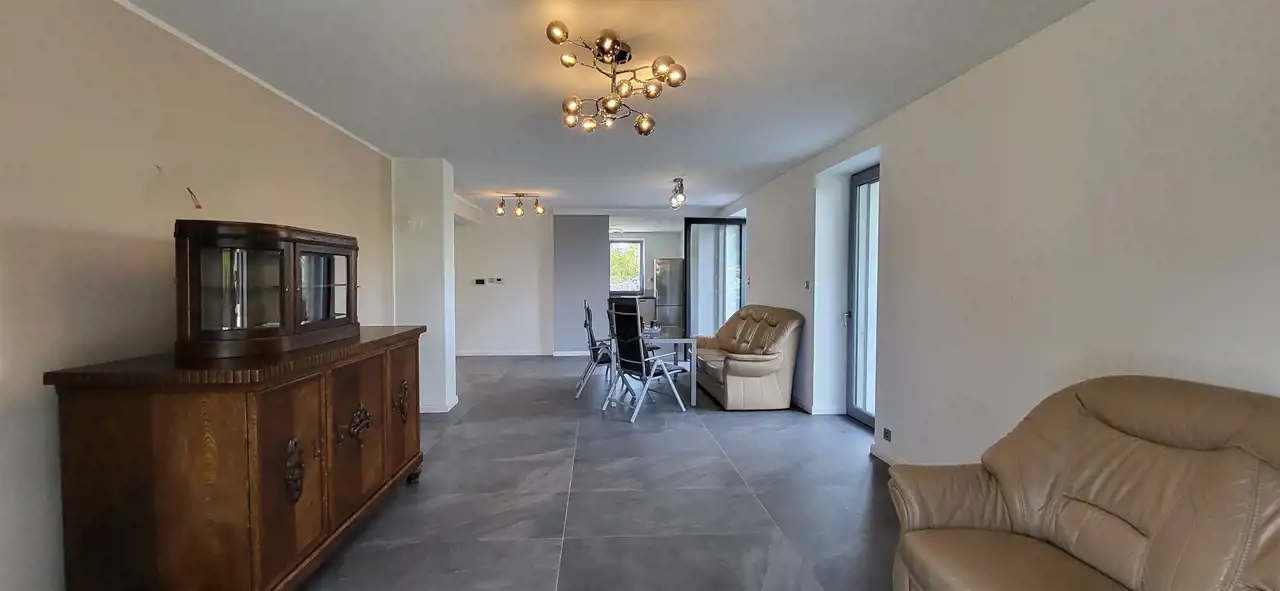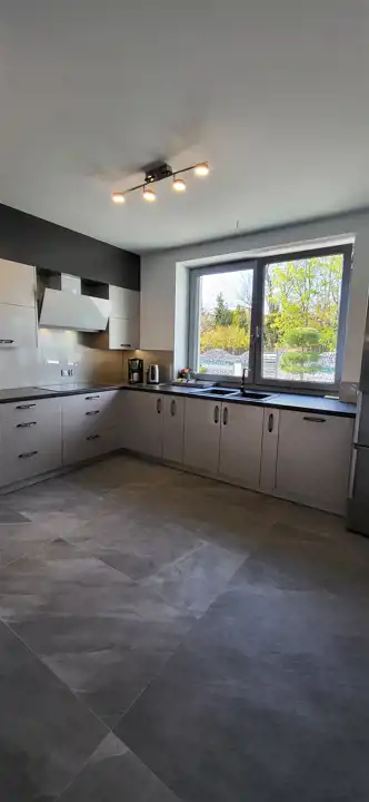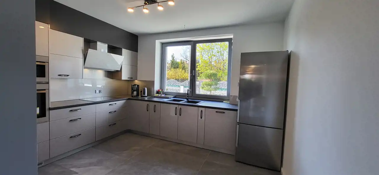 Wszystkie sprzęty nowe z gwarancją, bardzo wysoka jakość materiałów i wykończenia domu. Meble i sprzęty są nowe, na gwarancji. Sprzęt AGD na wyposażeniu: zmywarka, lodówka z zamrażarką, płyta indukcyjna, piekarnik, czajnik, pralka, zestaw nagłośnieniowy zabudowany w suficie salonu. Mieszkanie jest bardzo jasne, wygodne i przytulne, nowocześnie urządzone – idealne także do pracy w domu.