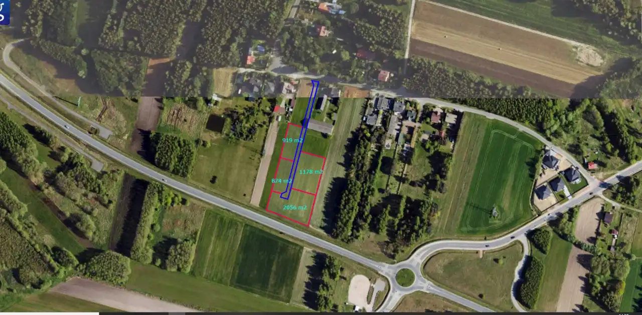 • 2056 m² – działka o nieregularnym kształcie, szerokość ok. 60 m, długość 27–35 m – idealna pod bardziej indywidualny projekt