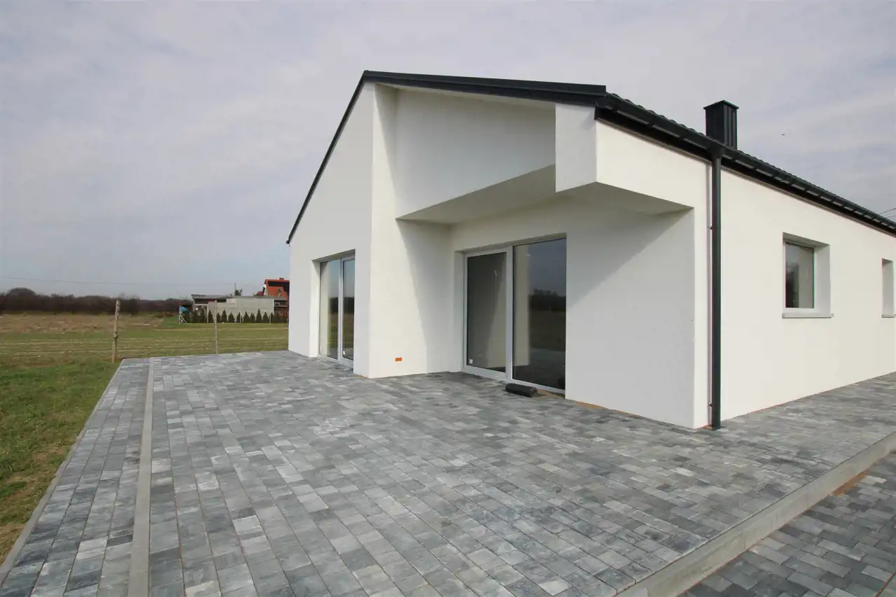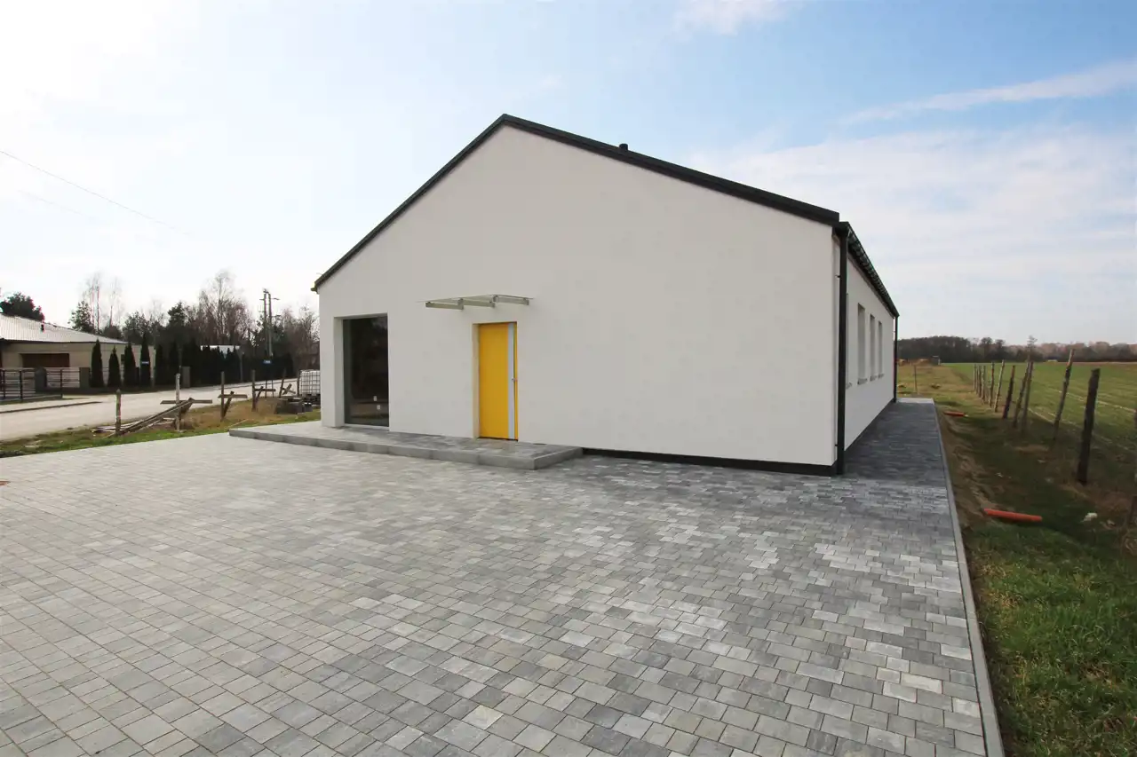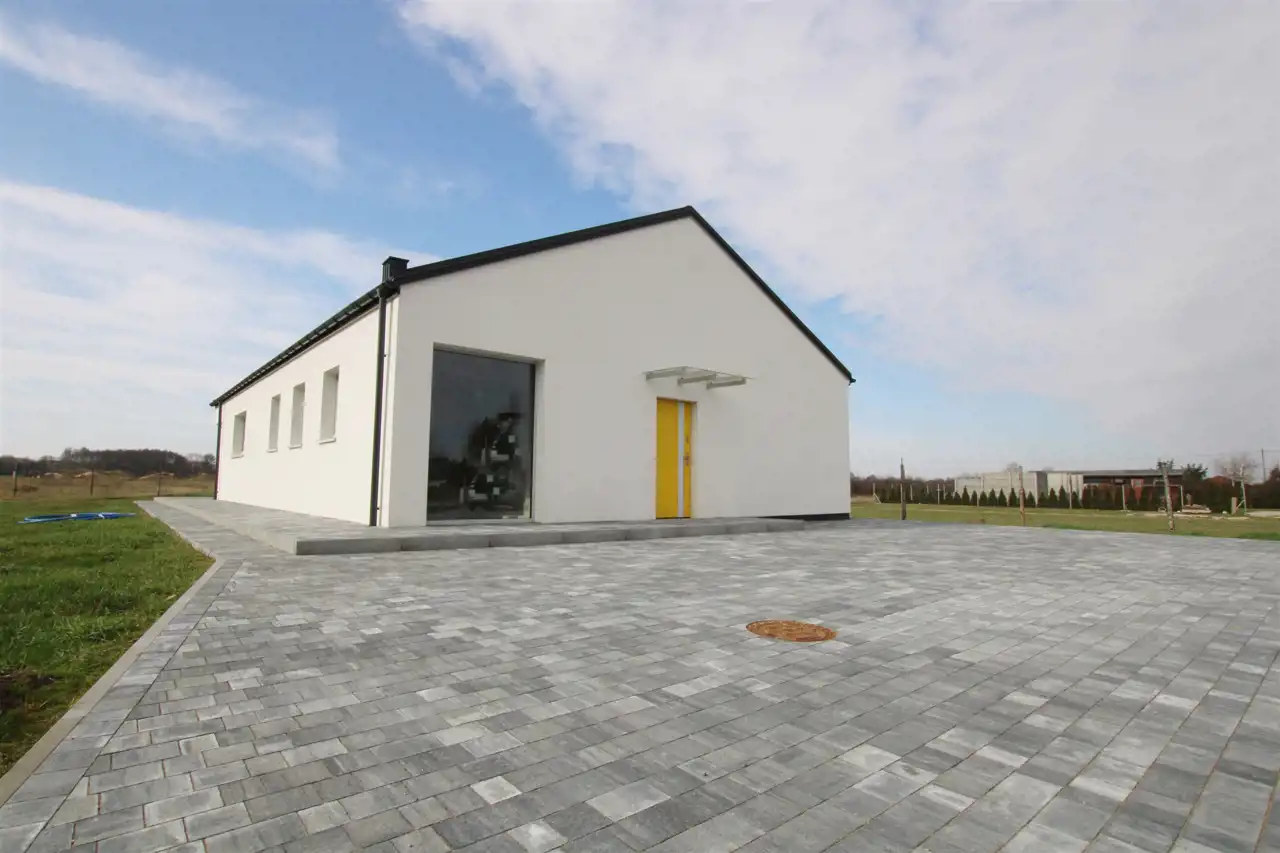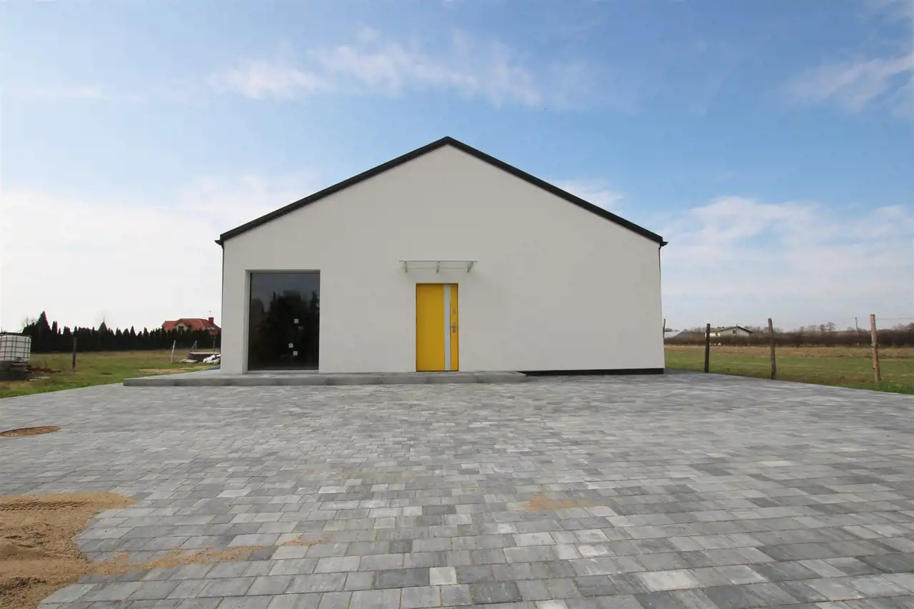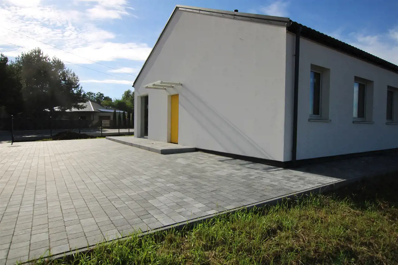 Wybrukowano podjazd przed domem, opaskę wokół domu oraz taras znajdujący się z tyłu budynku.