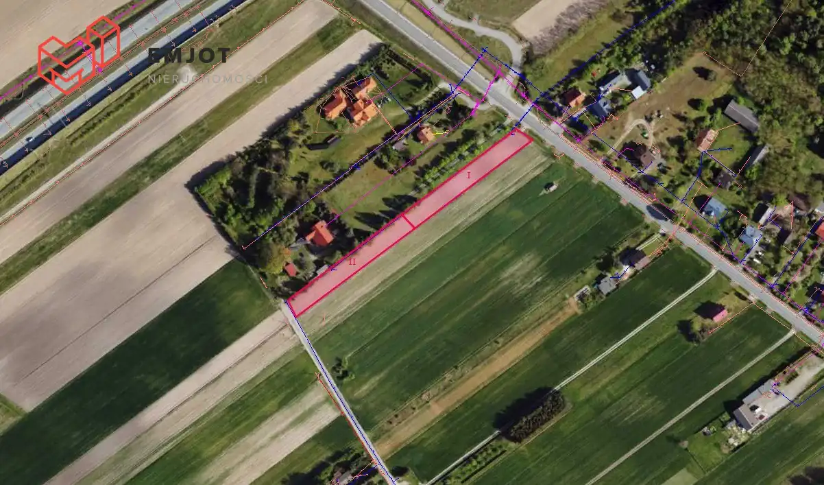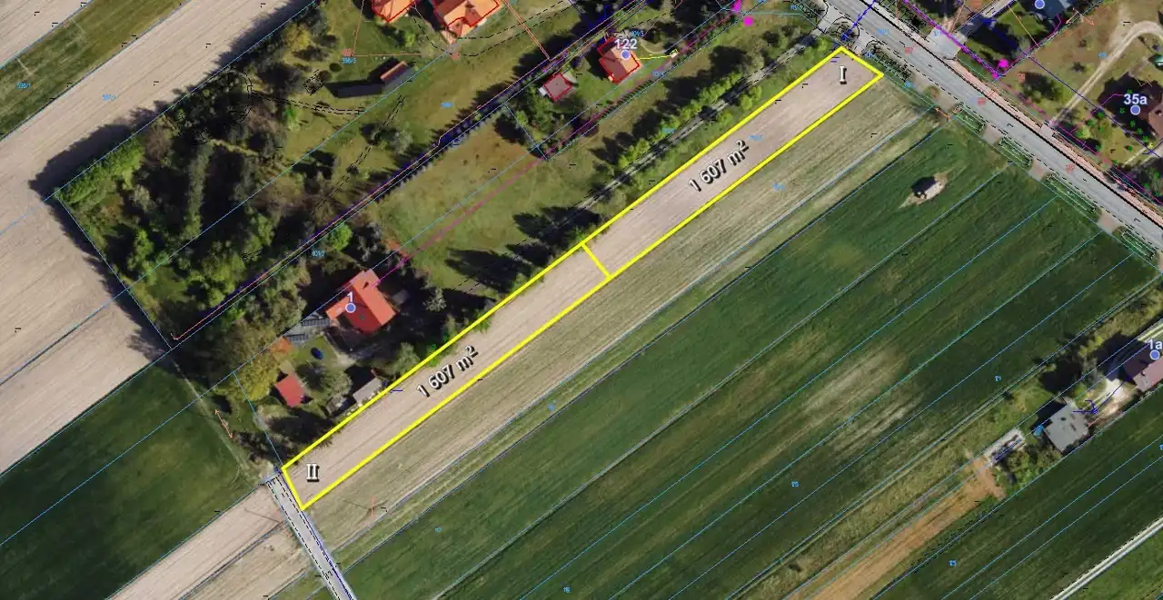 - Działki o wymiarach: 107 m x 15 m