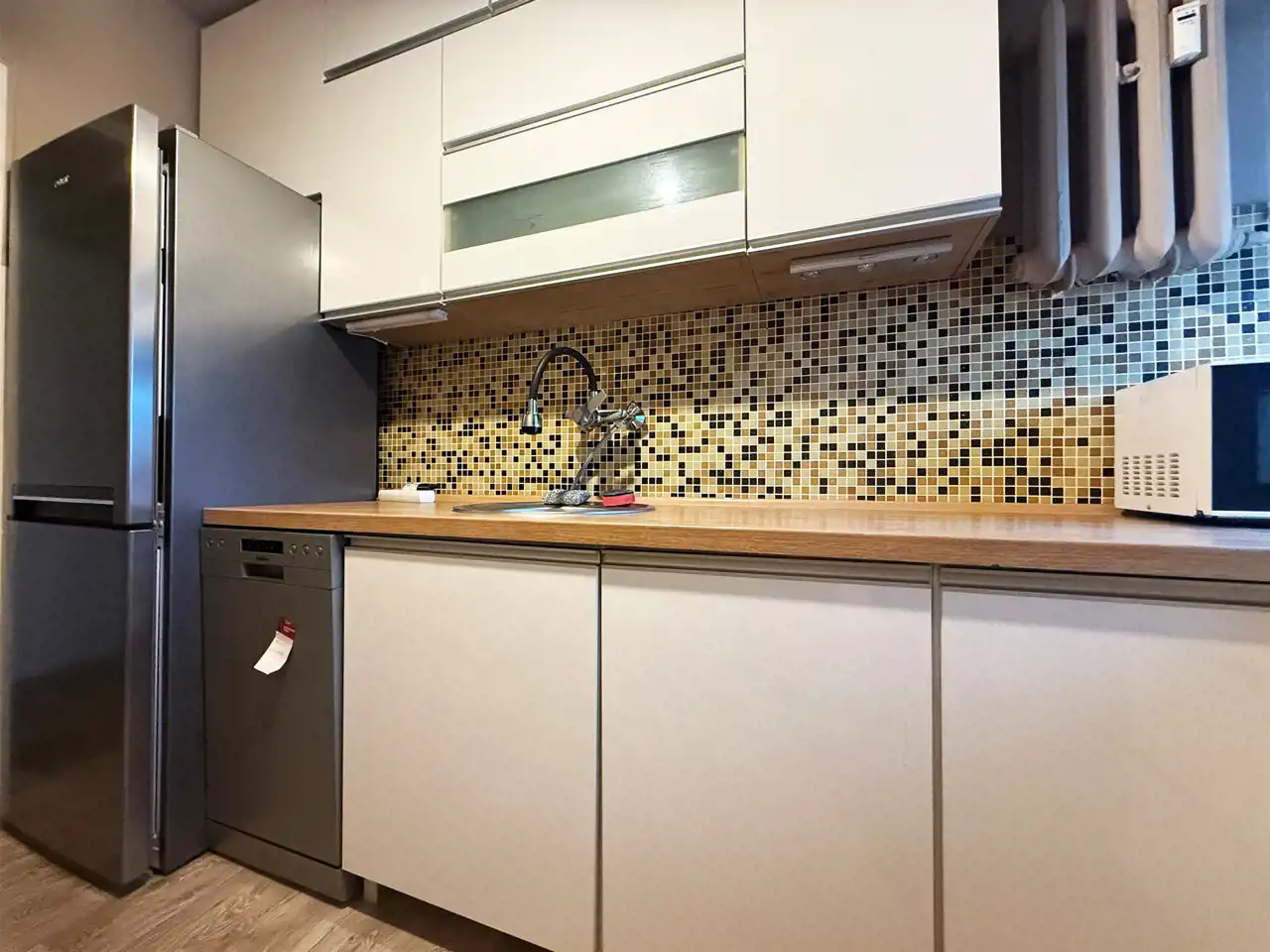 - kuchni, pomieszczenie z oknem, wyposażone w meble w zabudowie oraz wszystkie niezbędne sprzęty AGD: kuchenkę gazową, zmywarkę, lodówko-zamrażarkę. Na podłogach wykładzina, na ścianach tynki ozdobne oraz częściowo glazura;