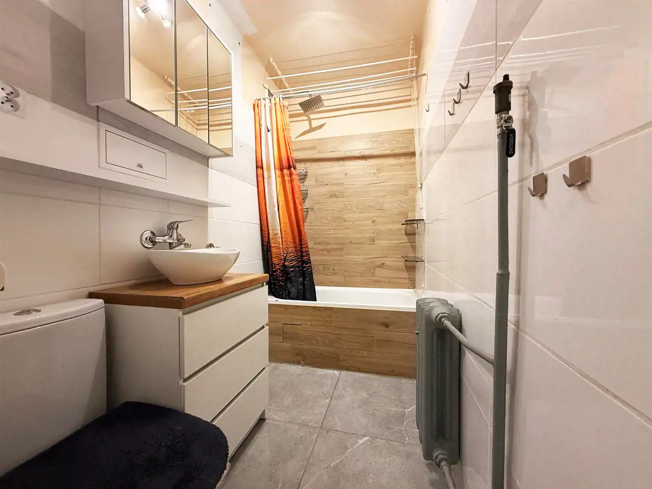 - łazienki razem z wc, wyposażonej w wannę, na ścianach oraz na podłogach glazura nowszego typu;