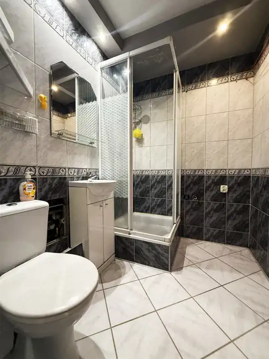 - łazienka z wc; wyposażona w kabinę prysznicową; brak bojlera - ciepła woda z sieci; na podłogach i ścianach glazura starszego typu ale w dobrym stanie technicznym.