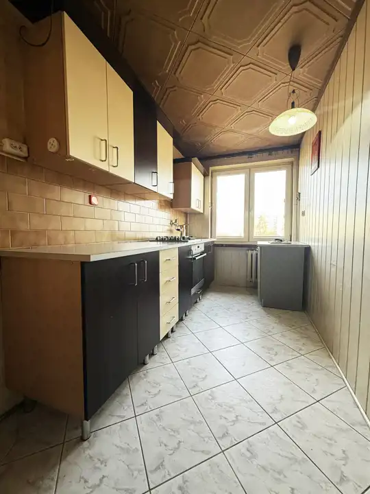 - kuchnia; oddzielne i widne pomieszczenie; na podłogach kafle, na ścianach tapety.