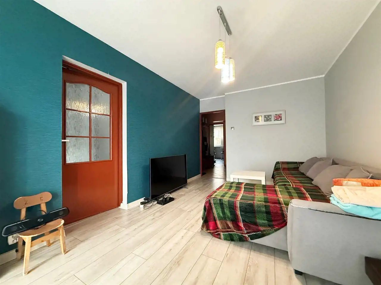 SALON: przestronne pomieszczenie w kształcie prostokąta w wyjściem na balkon typu loggia. Na ścianach znajdują się gładzie gipsowe, na podłodze panele.