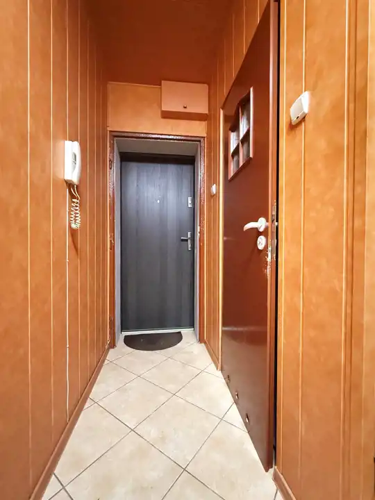 KORYTARZ: Pomieszczenie w kształcie litery "L". Na podłodze znajdują się kafle, na ścianach boazeria.