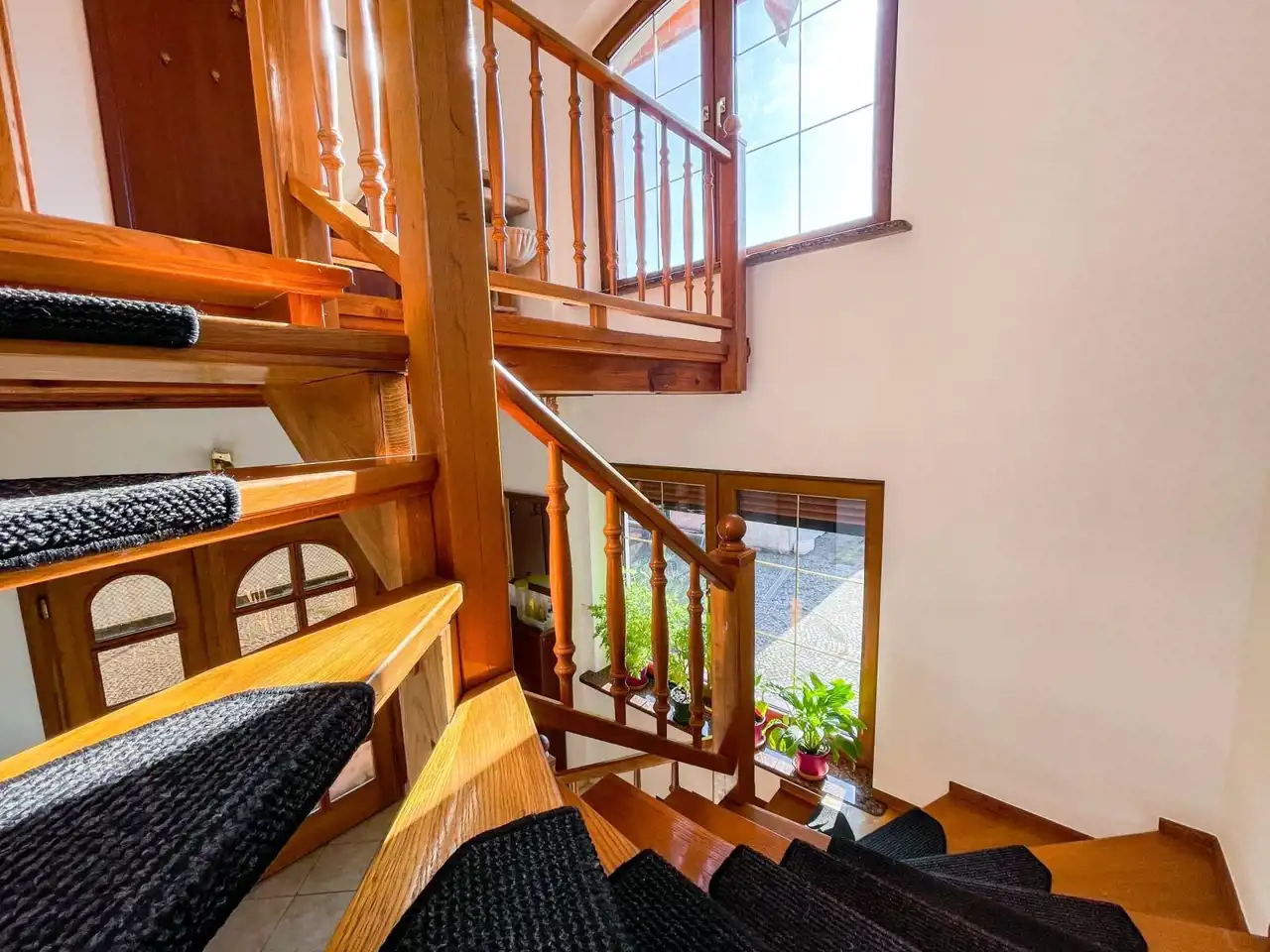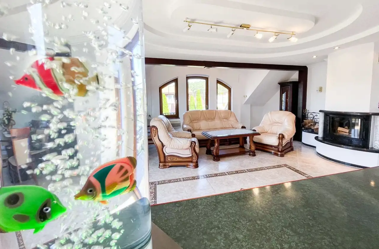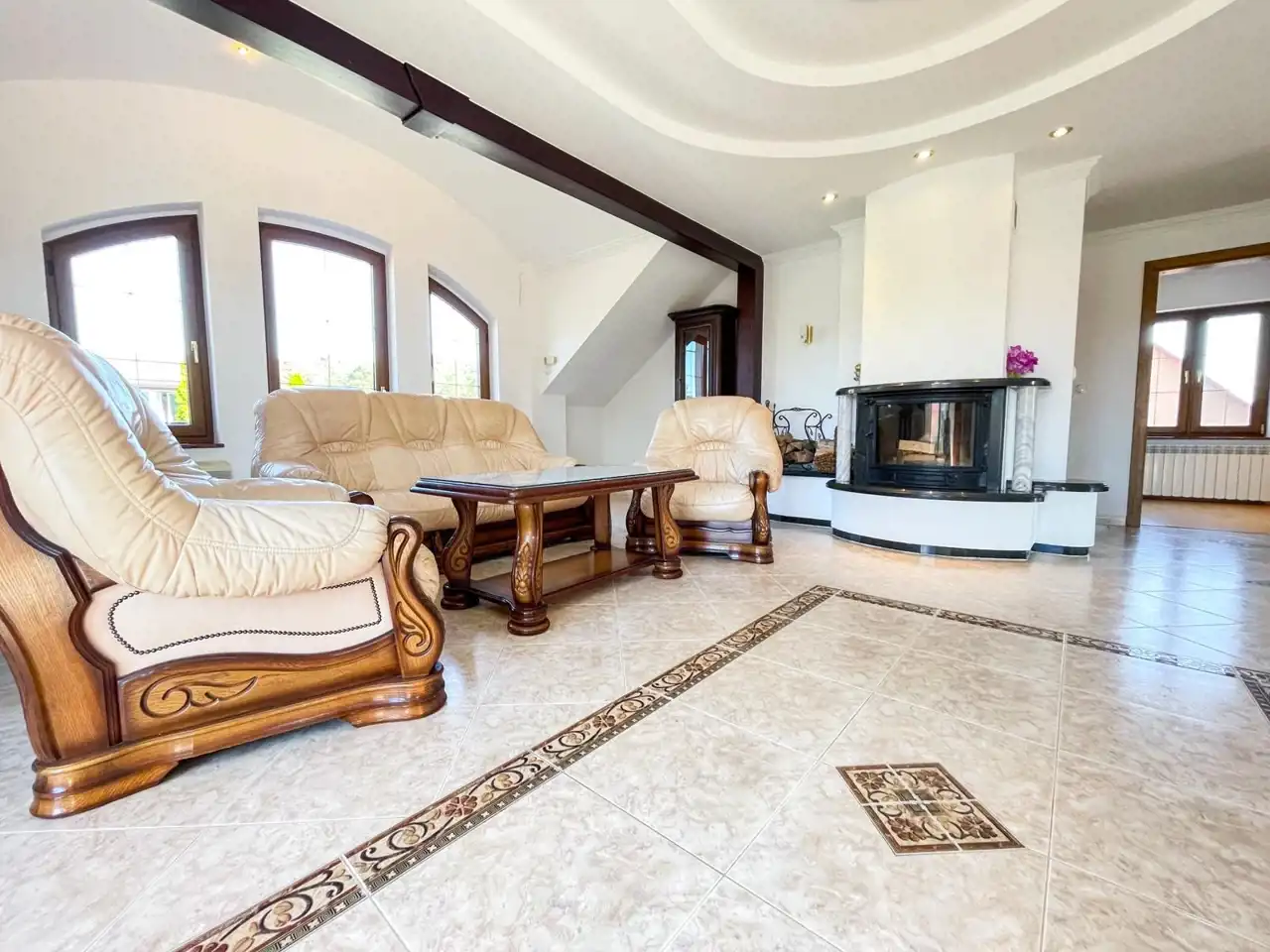 - Stylowe wykończenie – drewniane schody, okna PCV, drewniane podłogi oraz eleganckie drzwi z witrażami podkreślają wyjątkowy charakter domu.