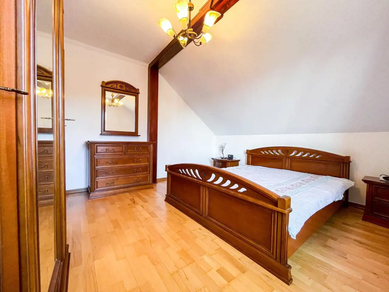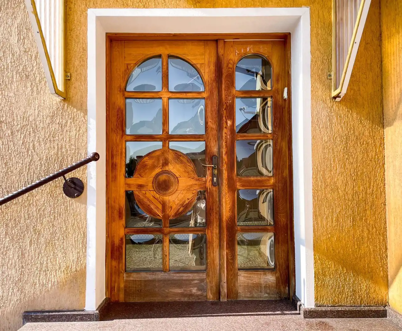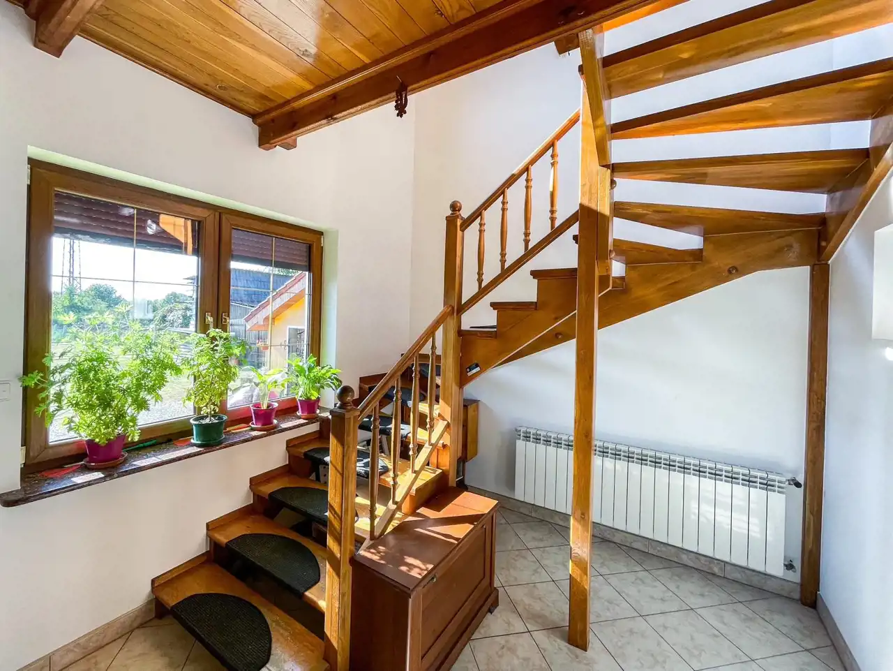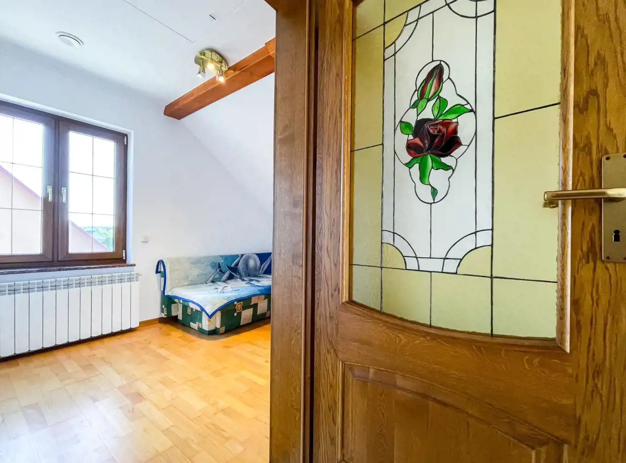- Stylowe wykończenie – drewniane schody, okna PCV, drewniane podłogi oraz eleganckie drzwi z witrażami podkreślają wyjątkowy charakter domu.