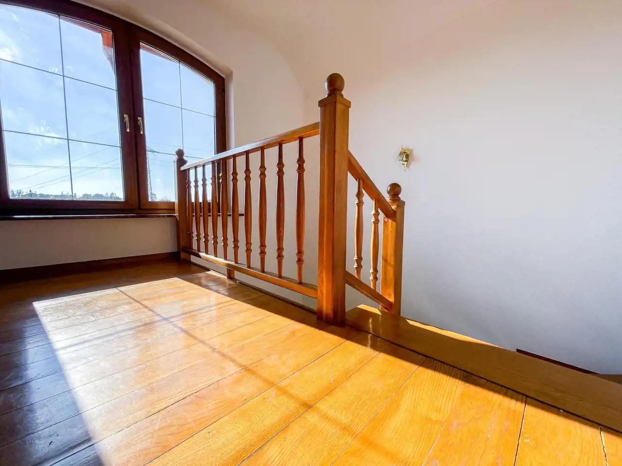 - Klatka schodowa (12 m²) – imponująca, otwarta na dwie kondygnacje, z dużymi oknami, które wpuszczają mnóstwo naturalnego światła, nadając wnętrzu wyjątkowego charakteru.