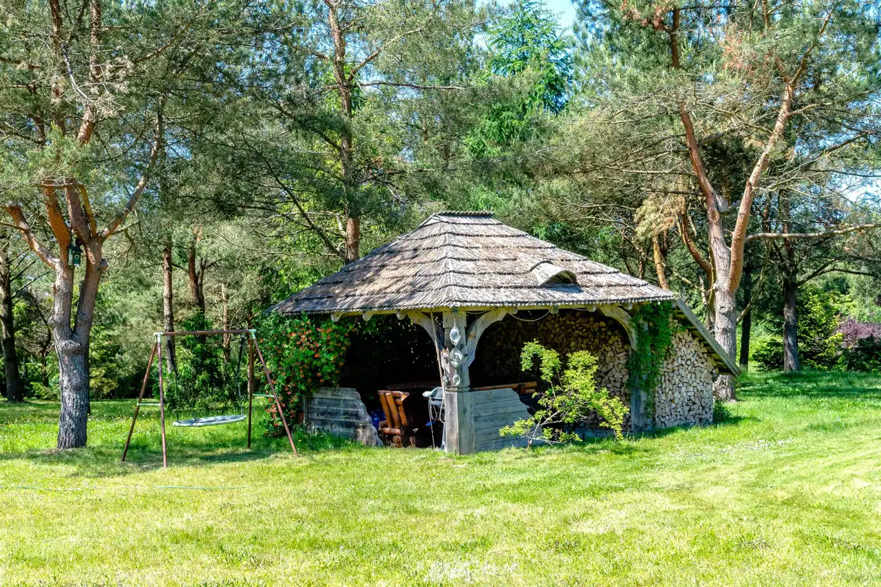 oryginalna drewniana altana grillowa z pomieszczeniem na sezonowanie drewna