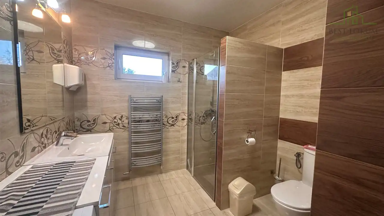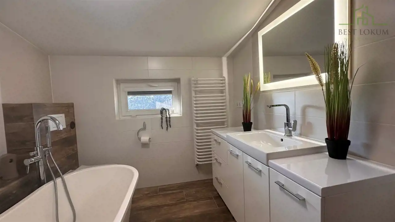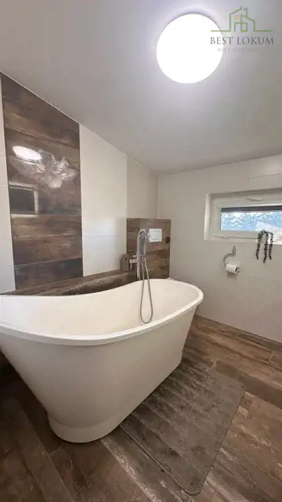 kuchnia z jadalnią oraz łazienka z prysznicem, kotłownia z kotłem 2 funkcyjnym na gaz, pralnia oraz pomieszczenie gospodarcze.