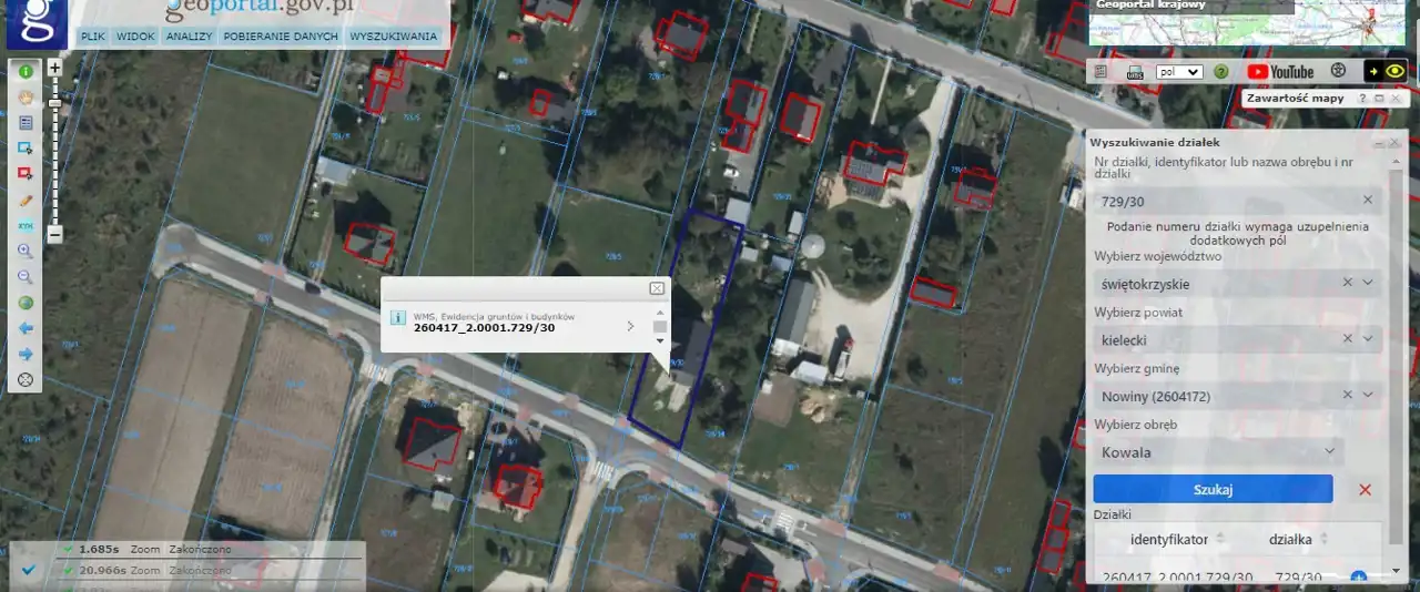 The house is situated on a rectangular plot of 1089 m², with approximate dimensions of 20 x 60 x 20 x 63 meters. Excellent location, with newly built single-family houses nearby, and easy access to Kielce, Bilcza, and Morawica.