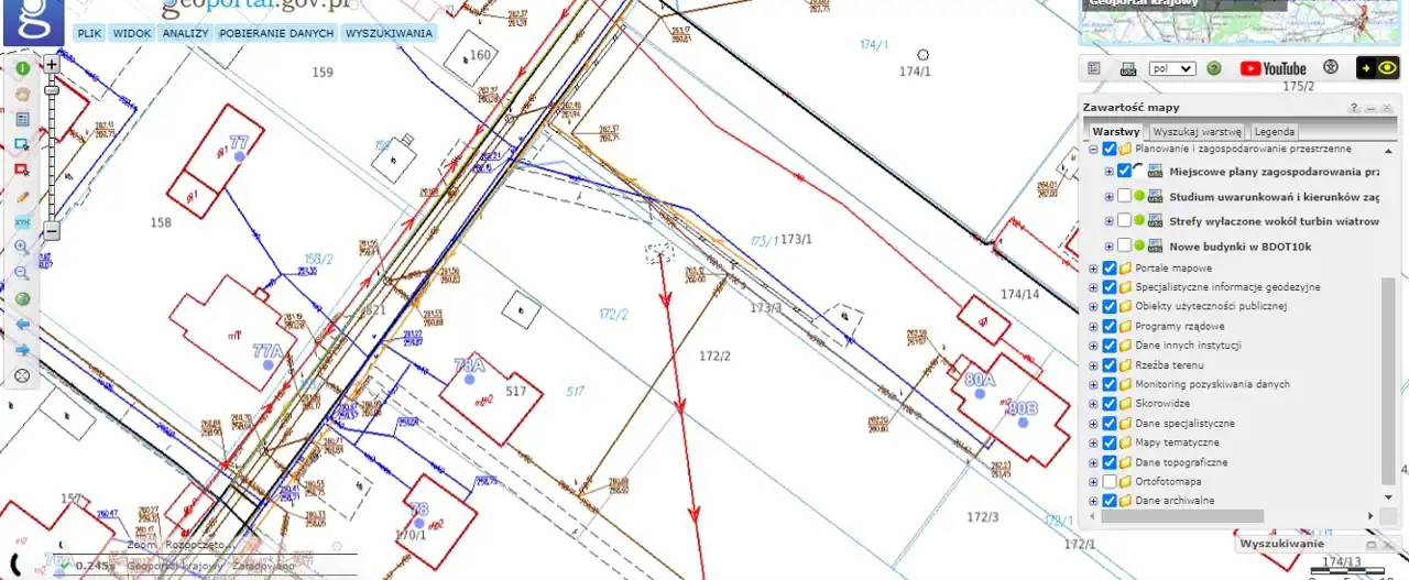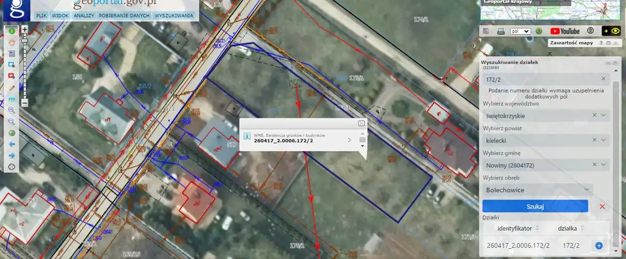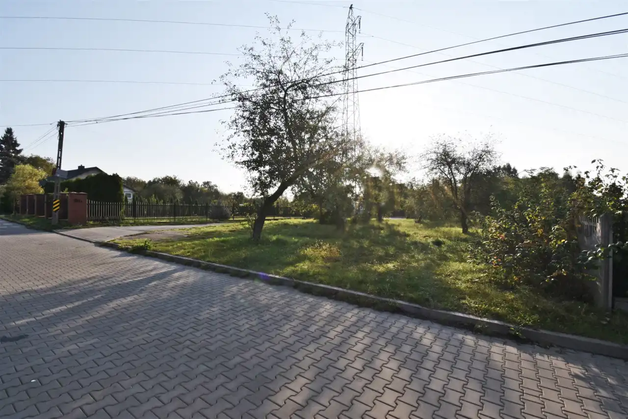 For sale: A plot of land measuring 1332 m², including a share in an internal access road. The plot is located in Bolechowice, Nowiny municipality. The surrounding area consists of single-family homes. The plot is a corner lot, accessible either from the front via an asphalt road or from the side via an internal gravel road.