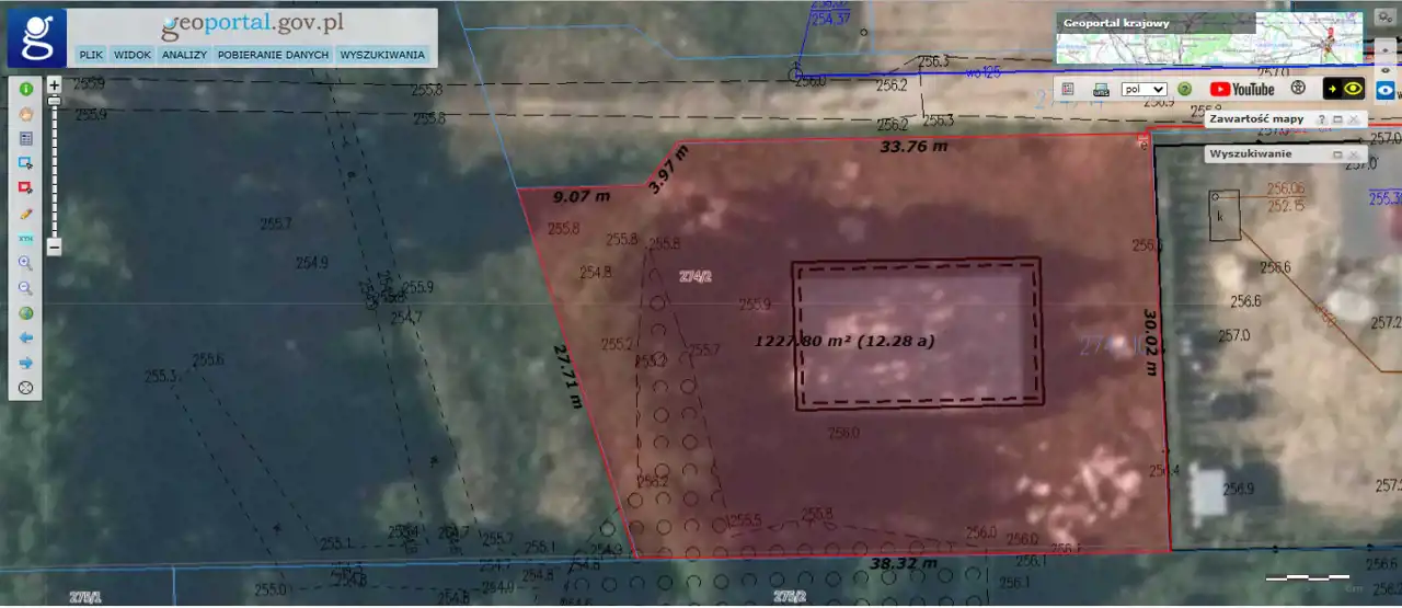 Wymiary działki: 47 x 27 x 38 x 30 [m]. Szerokość od frontu: 47 m