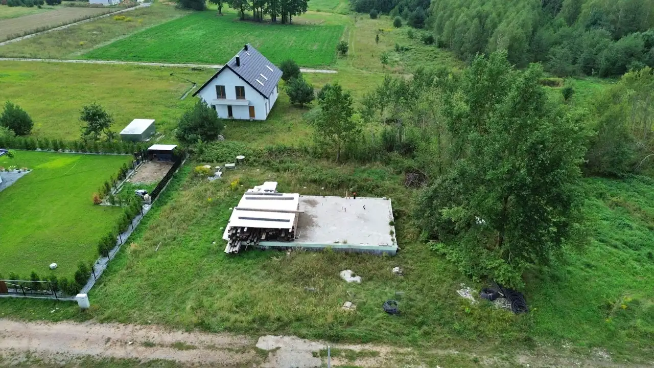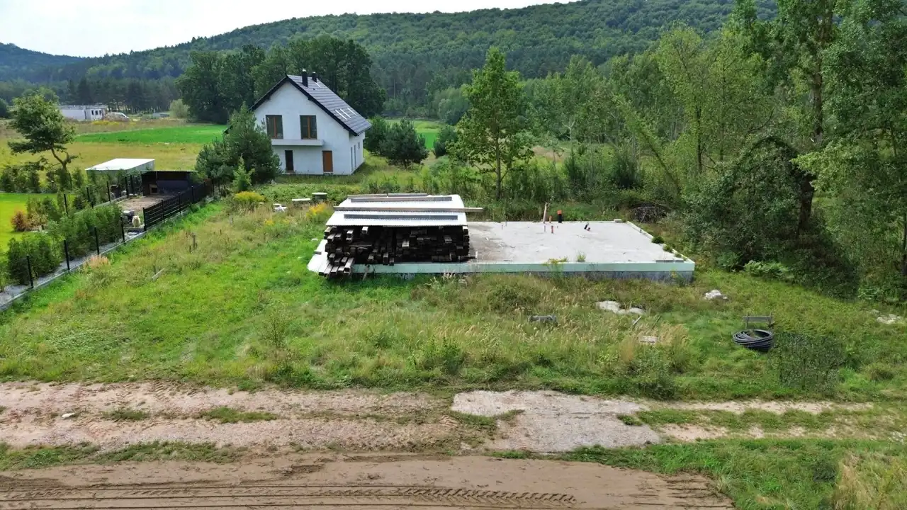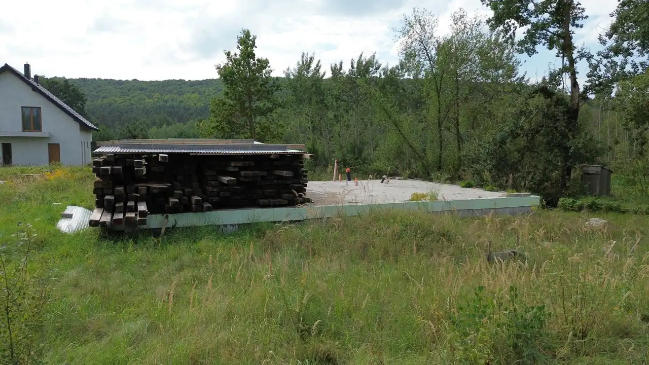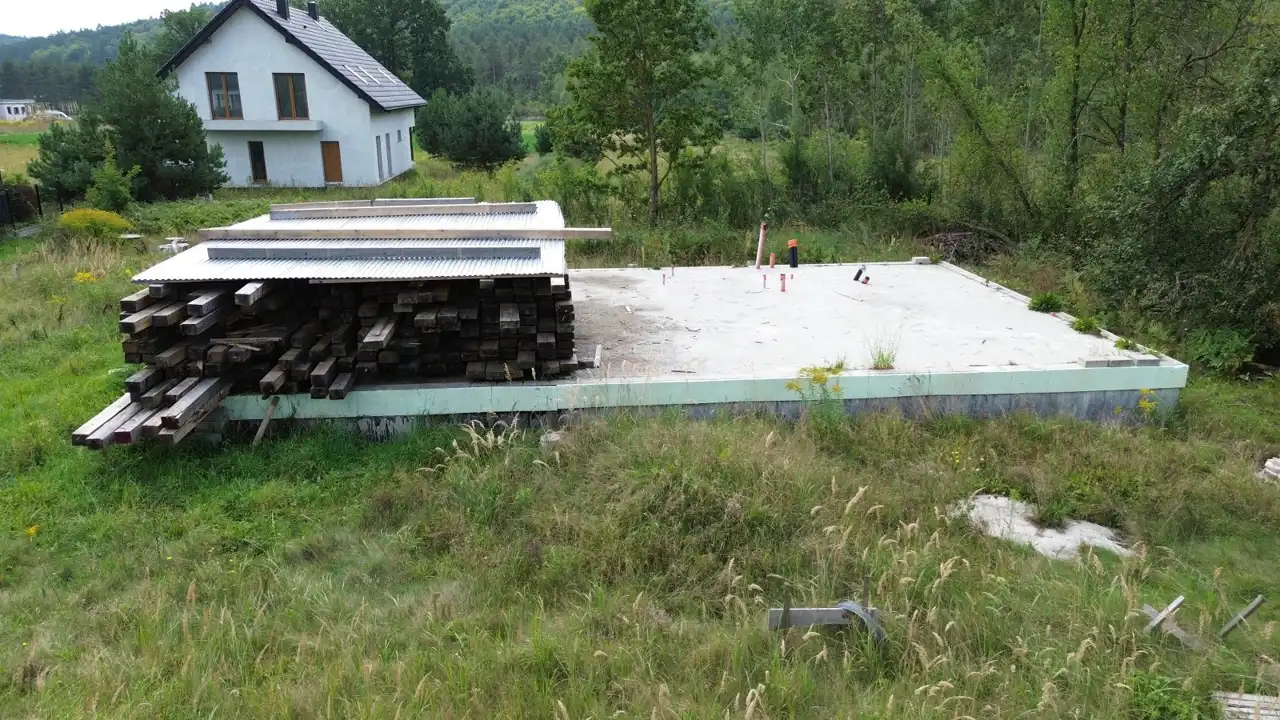 A building permit was issued in 2021. Foundations were made in 2022. Water and sewage installations have already been brought out. Foundation materials: compacted sand + 15 cm styrofoam under the floor + 10 cm concrete screed. The owners are leaving already dried construction timber, stored under a tarpaulin.