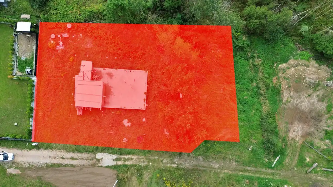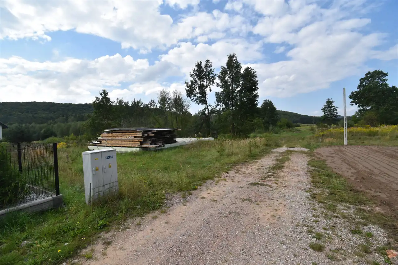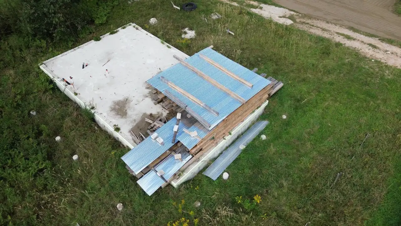 A building permit was issued in 2021. Foundations were made in 2022. Water and sewage installations have already been brought out. Foundation materials: compacted sand + 15 cm styrofoam under the floor + 10 cm concrete screed. The owners are leaving already dried construction timber, stored under a tarpaulin.