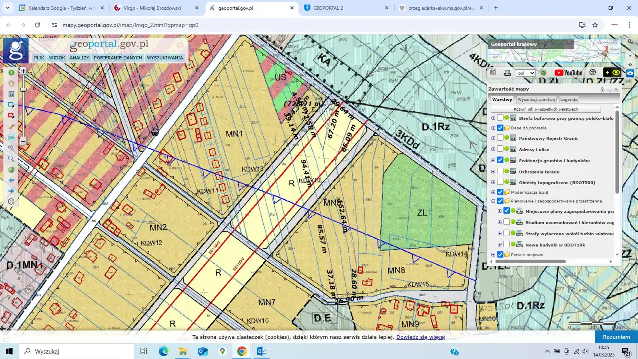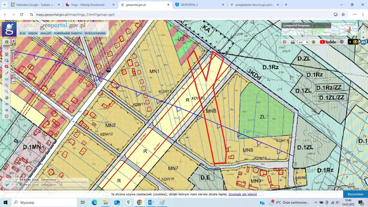 The plot is covered by the Local Spatial Development Plan and is designated as MN1 - single-family residential area (approx. 5,083 m²) and KDW10 - internal road area (approx. 4,500 m²).