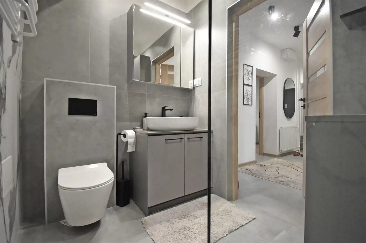 Ogrzewanie z sieci lokalnej, ciepła woda z elektrycznego podgrzewacza wody. Do mieszkania przynależy piwnica (pow. 6,9 m2). Mieszkanie po remoncie w 2023 roku. Na podłogach panele i gres. Okna PCV z zamontowanymi zewnętrznymi roletami antywłamaniowymi. Mieszkanie ciepłe.