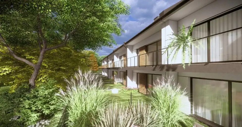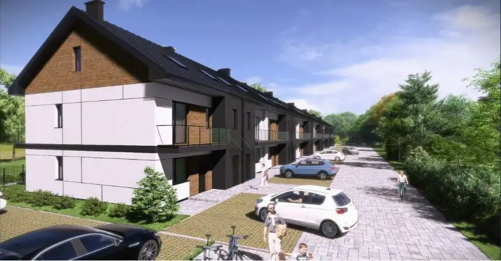 This modern development consists of 12 row houses, containing 24 maintenance-free apartments, located on the ground floor and first floor. All ground-floor units are equipped with their own garden, separated by a 2D panel fence. Each unit has an independent entrance and its own electricity, gas, and water meter. There is an option to purchase an entire segment with a total area of 190 m² (ground floor with a garden and upper floor with terraces).