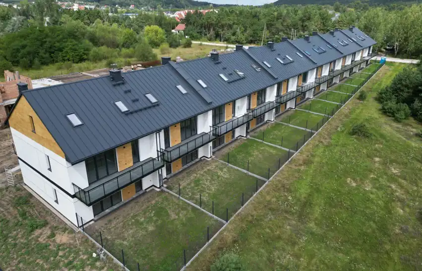 This modern development consists of 12 row houses, containing 24 maintenance-free apartments, located on the ground floor and first floor. All ground-floor units are equipped with their own garden, separated by a 2D panel fence. Each unit has an independent entrance and its own electricity, gas, and water meter. There is an option to purchase an entire segment with a total area of 190 m² (ground floor with a garden and upper floor with terraces).