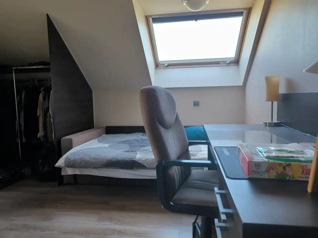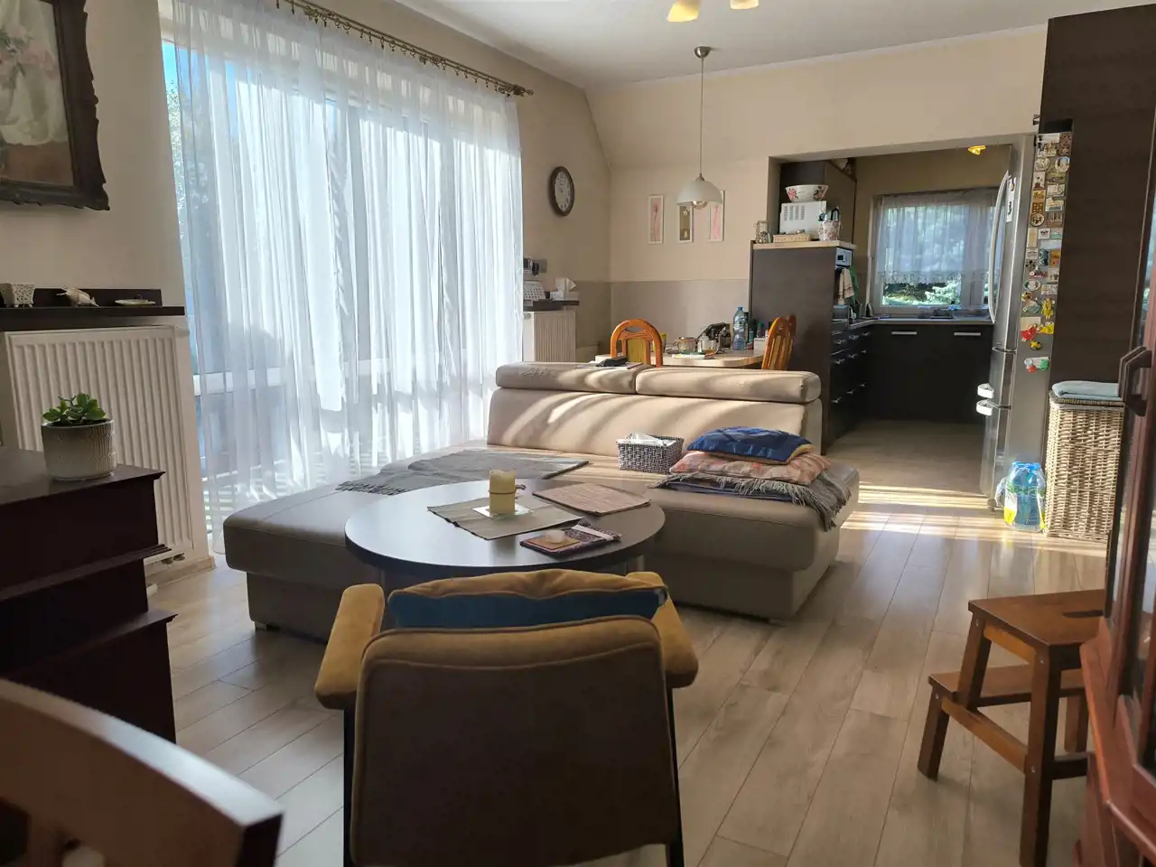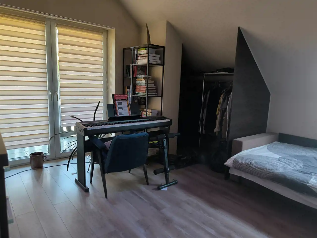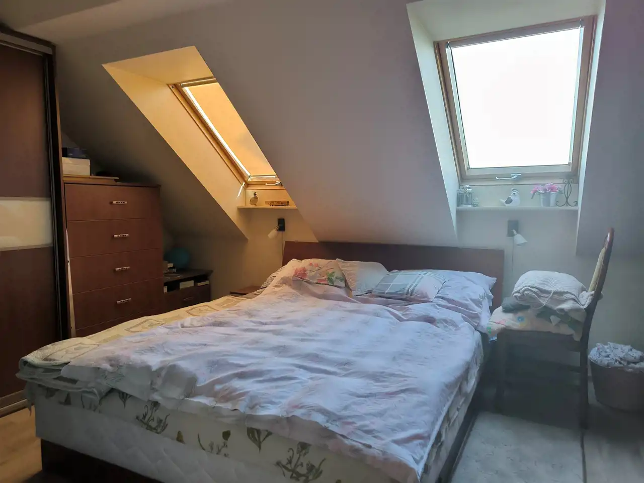 Piętro stanowi część mieszkalną – znajdują się tu trzy sypialnie, łazienka z wanną oraz WC i przestronny salon z aneksem kuchennym. Na podłogach w salonie i sypialniach położone są panele, natomiast w pozostałych pomieszczeniach – płytki ceramiczne.