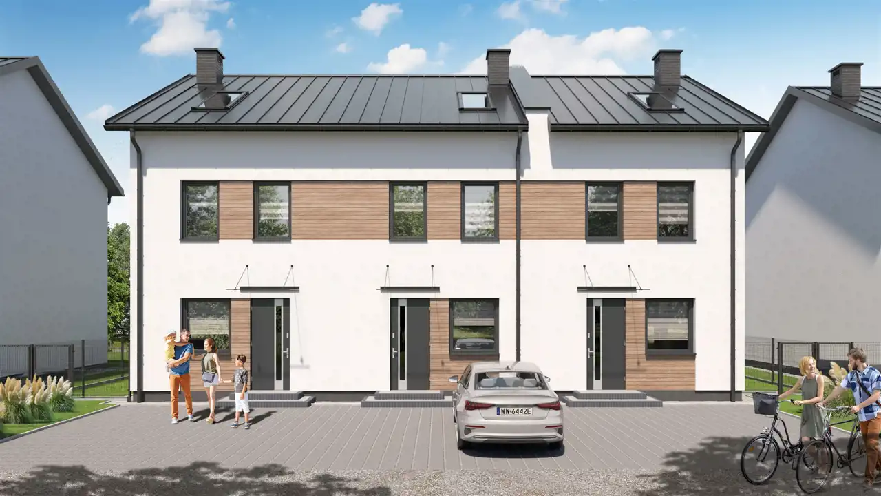 - fundamenty żelbetowe – zaizolowane oraz ocieplone styrodurem + folia kubełkowa, ściany nośne (19cm) i działowe (10cm) wykonane z betonu komórkowego, stropy i schody wewnętrzne żelbetowe, tynki gipsowe, wylewki cementowe, ocieplenie styropianem pod wylewki, dach pokrycie dachówka betonową płaską, kolor czarny – IBF + obróbki blacharskie z blachy kolor czarny, konstrukcja dachu drewniana, -rynny - PCV, ocieplenie budynku styropian 20cm + tynk akrylowy w kolorze jasnym, ocieplenie poddasza wełną 2x10 cm lub pianą PUR, okna trzy szybowe PVC – kolor z palety Standard, wewnątrz białe - DRUTEX, okna dachowe na poddaszu Roto lub Fakro, drzwi wejściowe stalowe z klamką, podjazd przed domem od drogi wewnętrznej utwardzenie z kamienienia, chodnik wraz z podestem przed wejściem do domu/lokalu wykonany z kostki, opaska od strony kuchni 100cm wysypana kamieniem (na szerokość domu/lokalu), ogrzewanie podłogowe w domu/lokalu (parter, piętro, poddasze), rozprowadzone media: instalacja elektryczna, wod.- kan., światłowód doprowadzony na działkę, przegrodzenia między lokalami od strony ogródków- wypełnienie deskami w kolorze szarym – od frontu teren otwarty, pompa ciepła montaż we własnym zakresie, teren wokół domu/lokalu uporządkowany, kran z ujęciem wody od strony kuchni, droga wewnętrzna współwłasność w cenie 15tys.zł.