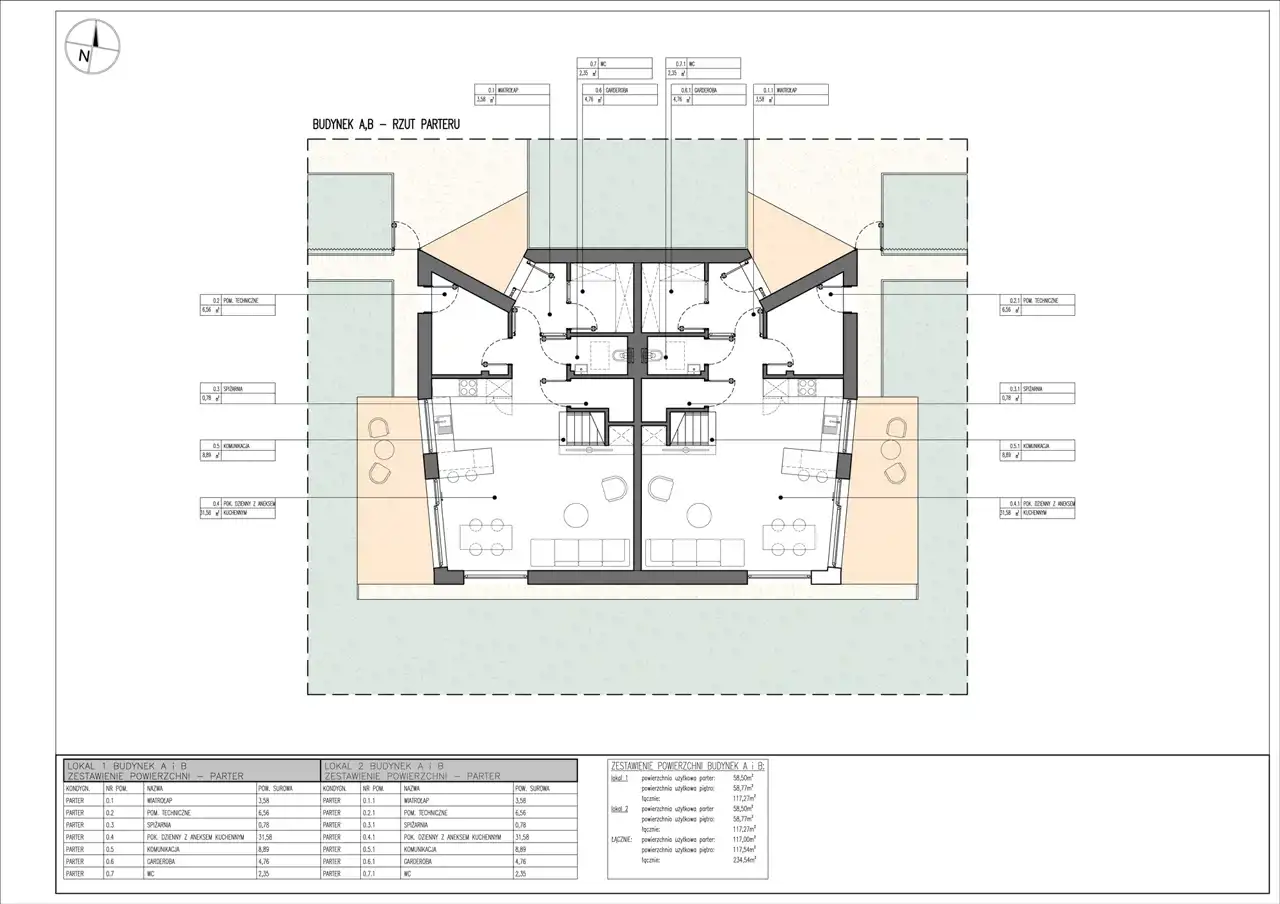 - parter: wiatrołap (3,58m2), pom. techniczne (6,56m2), spiżarnia (0,78m2), pokój dzienny z aneksem (31,04m2), komunikacja (8,89m2), garderoba (4,76m2), WC (2,35m2) - razem 57,96m2