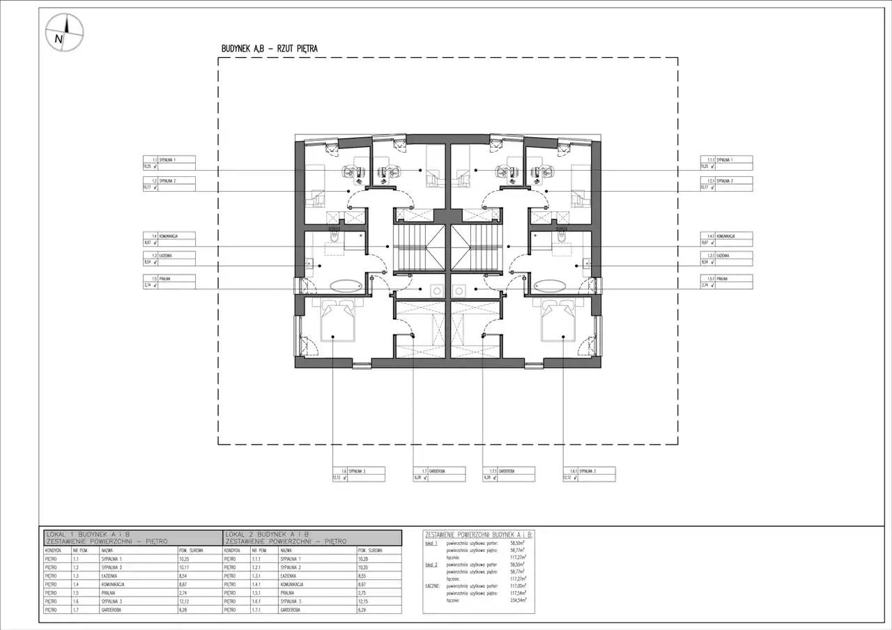 - piętro: sypialnia (10,17m2), sypialnia (10,25m2), łazienka (8,54m2), komunikacja (8,67m2), pralnia (2,74m2), sypialnia (12,12m2), garderoba (6,28m2) - razem 58,77m2