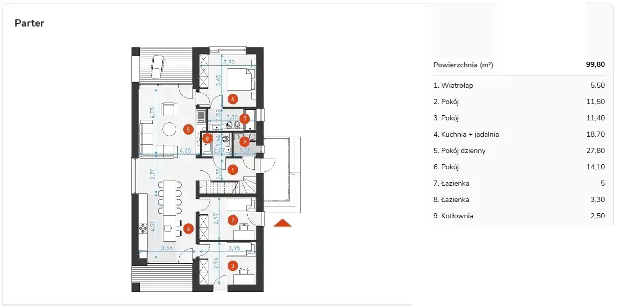 Parter: wiatrołap (5,5m2), pokój (11,5m2), pokój (11,4m2), (kuchnia + jadalnia (18,7m2), pokój dzienny (27,8m2), pokój (14,1m2), Łazienka (5m2), łazienka (3,3m2), kotłownia (2,5m2) - razem 99,8m2