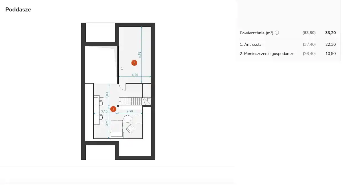 Poddasze: antresola (22,3m2), pom. gospodarcze (10,9m2) - razem 33,2m2